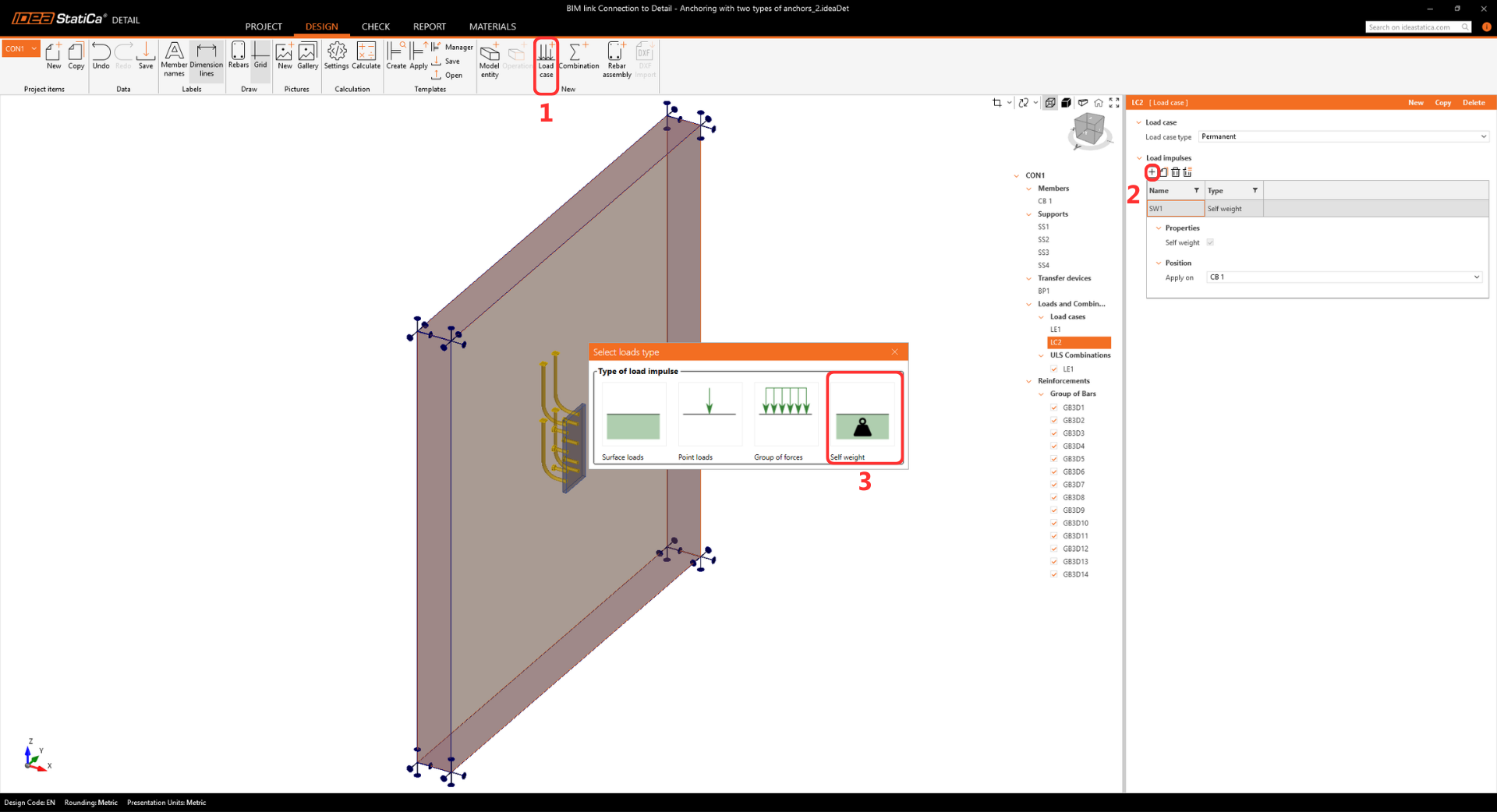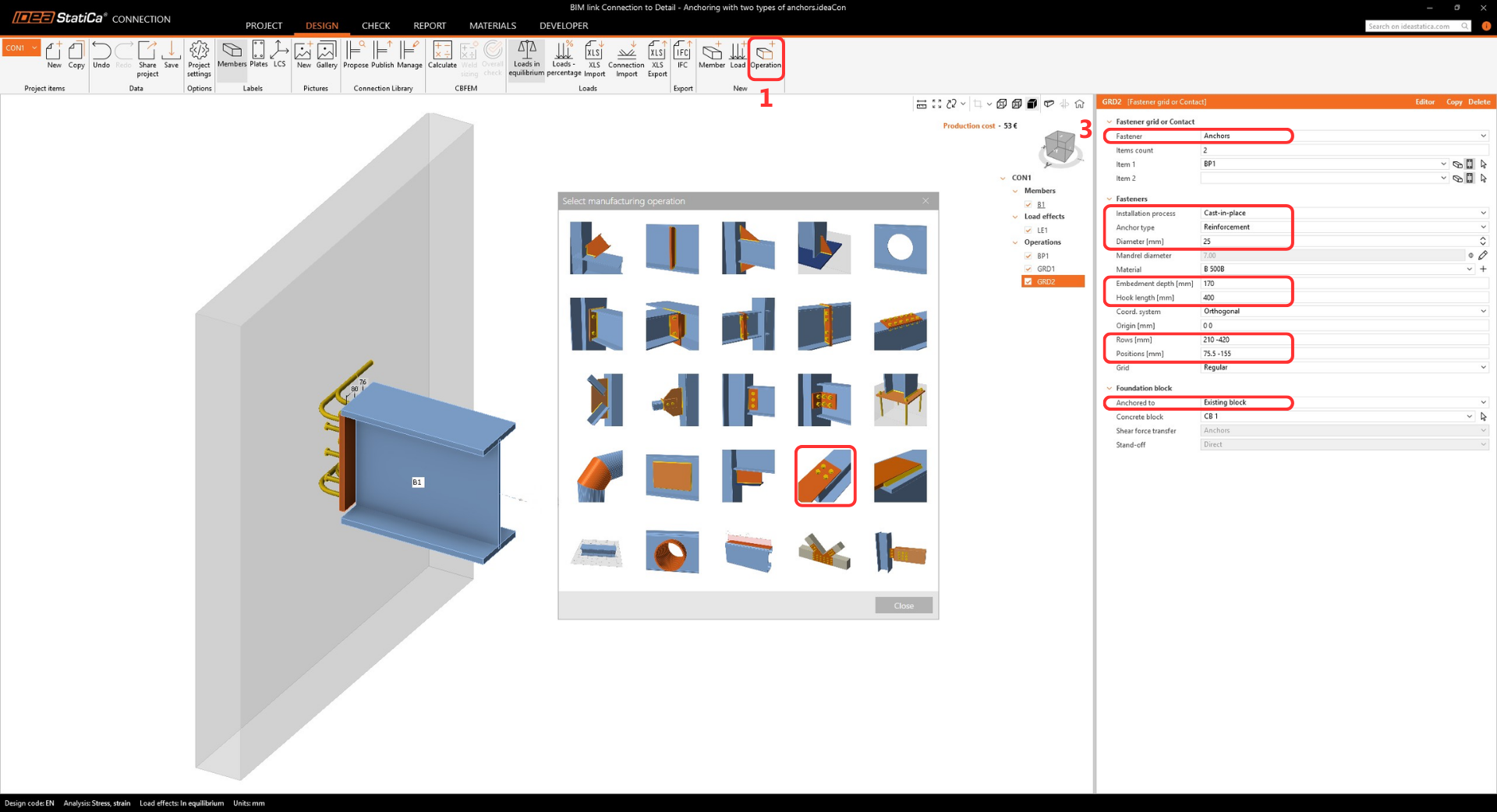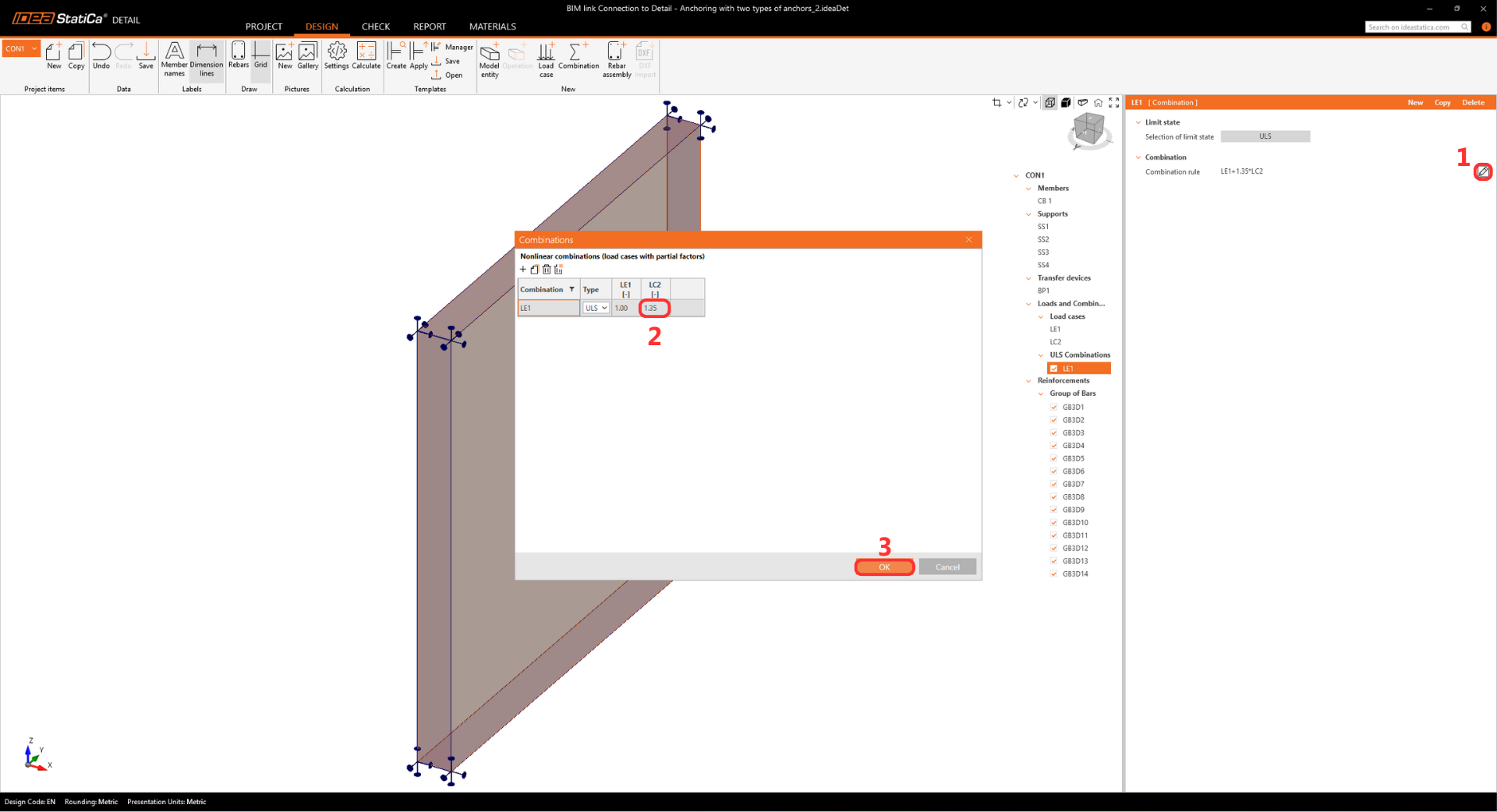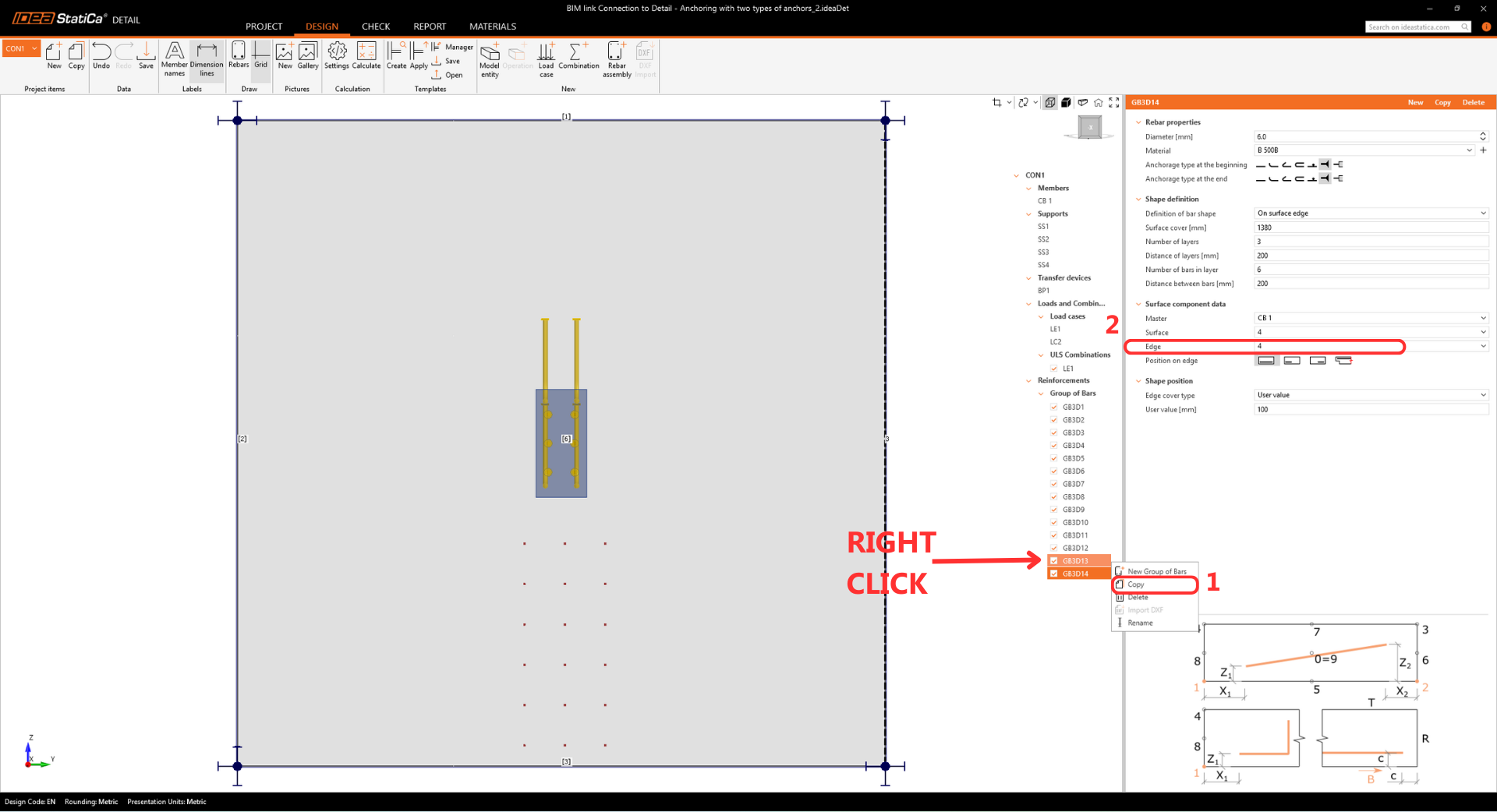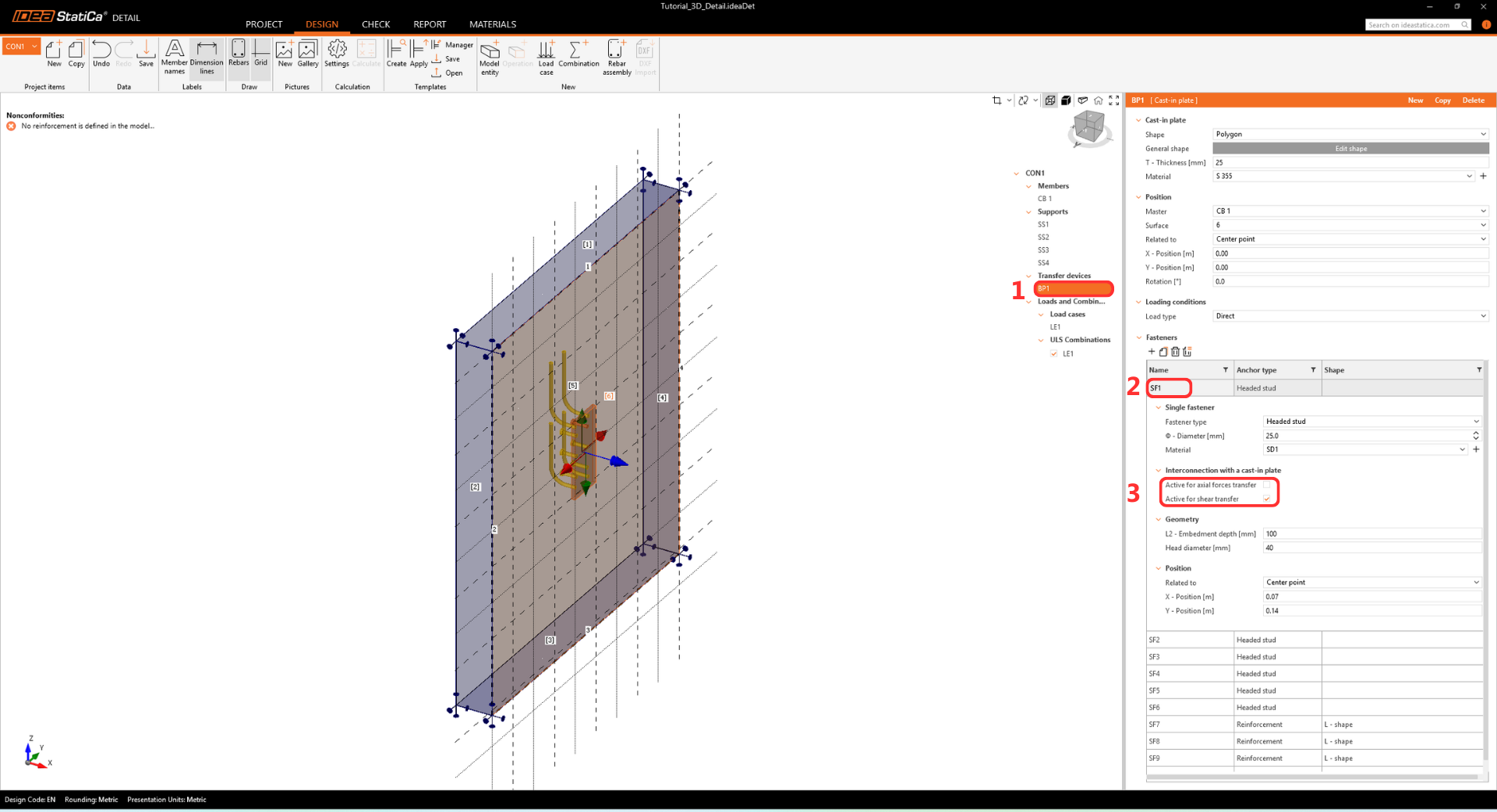 The anchors are imported from IDEA StatiCa Connection. Since the design uses two different anchor types, we will separate the load transfer to ensure a safe and predictable behavior. This approach aligns with standard UK engineering practice to resolve the limitation of EN 1992-4 (Cl. 1.2(4)), which excludes mixed anchor groups from the standard scope. By assigning shear and tension to specific anchor groups, we create a verified load path compliant with safety requirements.