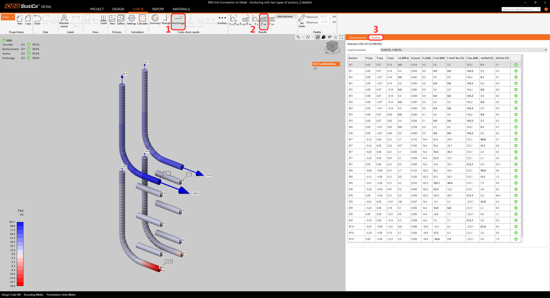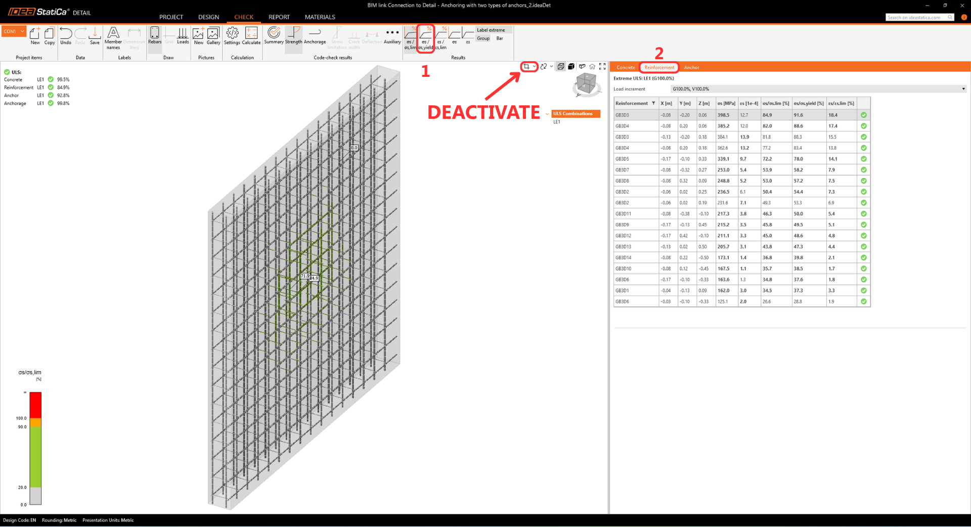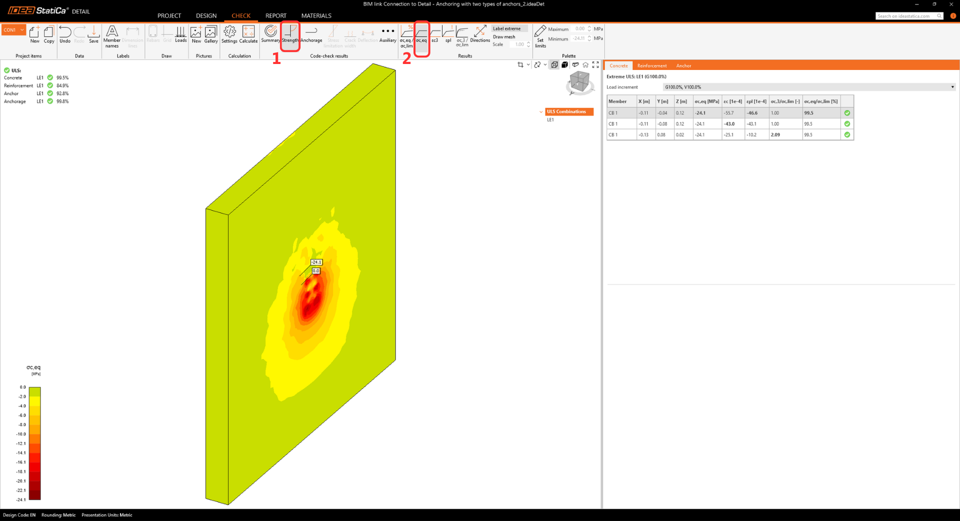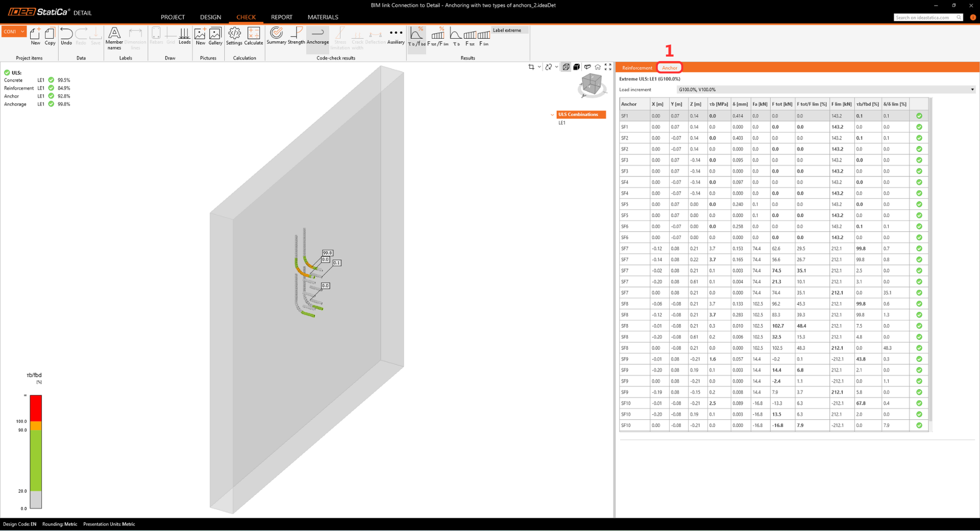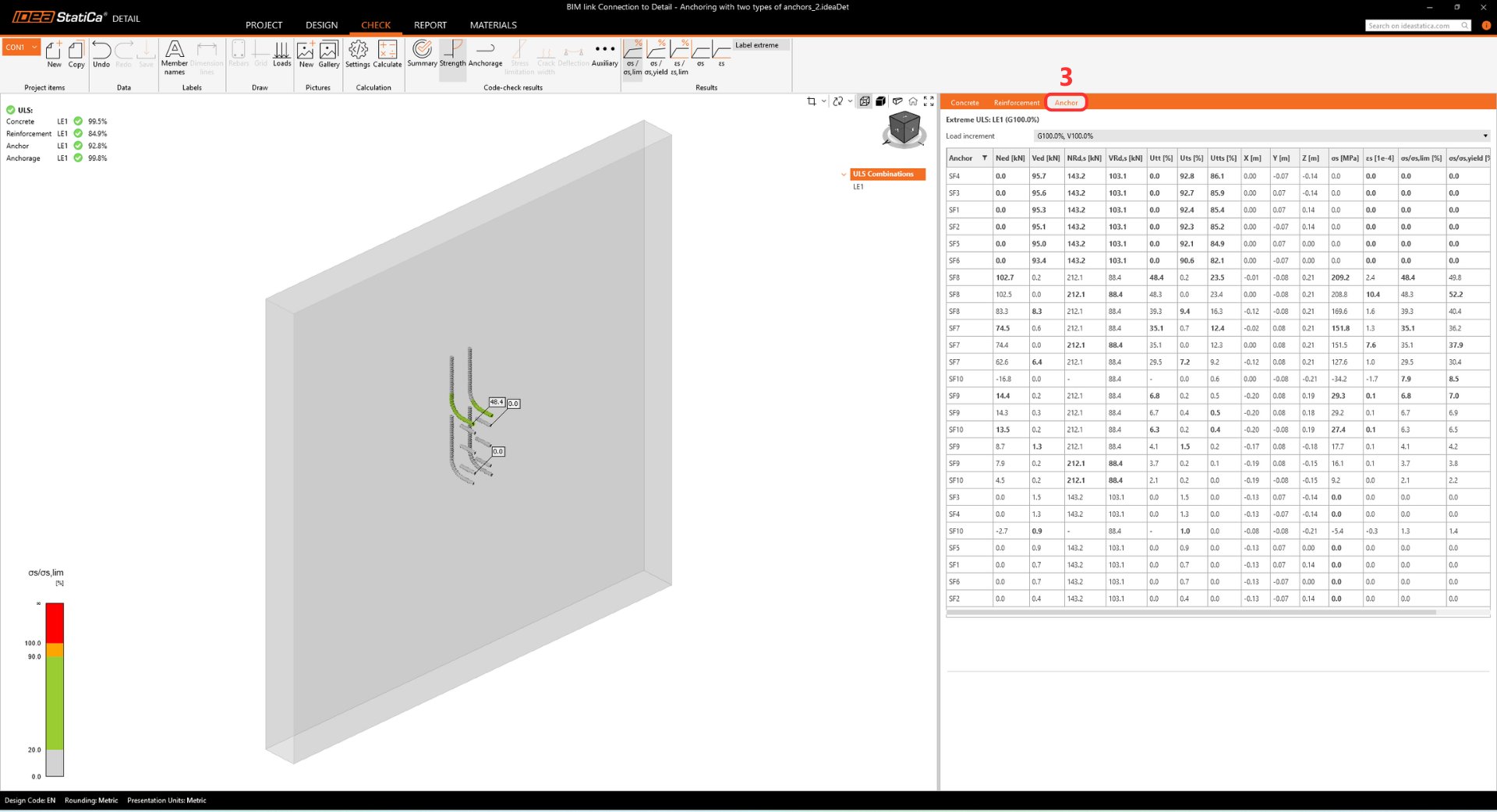 - According to EN 1992-4, Cl. 1.2(4), the design of anchor groups containing different anchor types is outside the scope of the standard. Consequently, the code-check fails by default. To verify this configuration properly, a detailed analysis using the 3D Detail module is required.