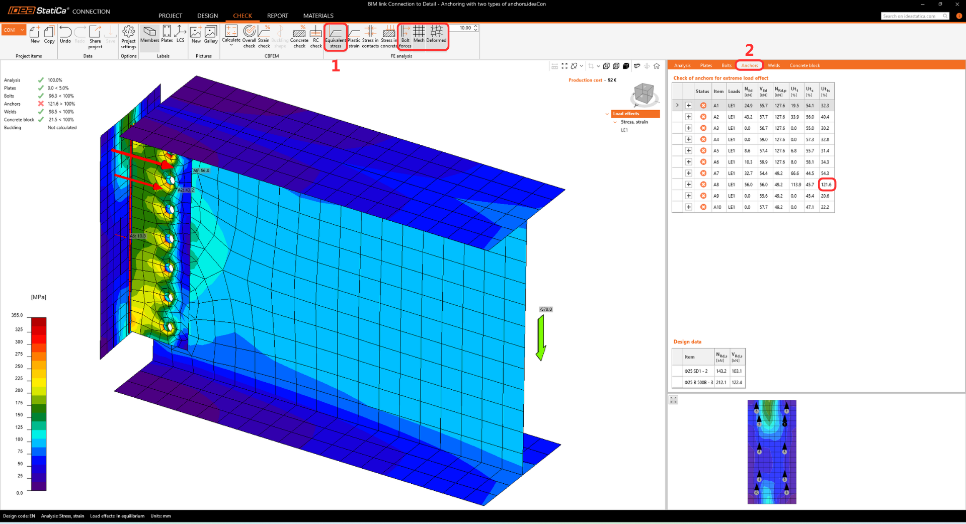 Let's explore the results. Select Equivalent stress, Bolt force, Mesh, Deformed, and Anchors. Generally, the table shows which anchors are approved and which are not.
