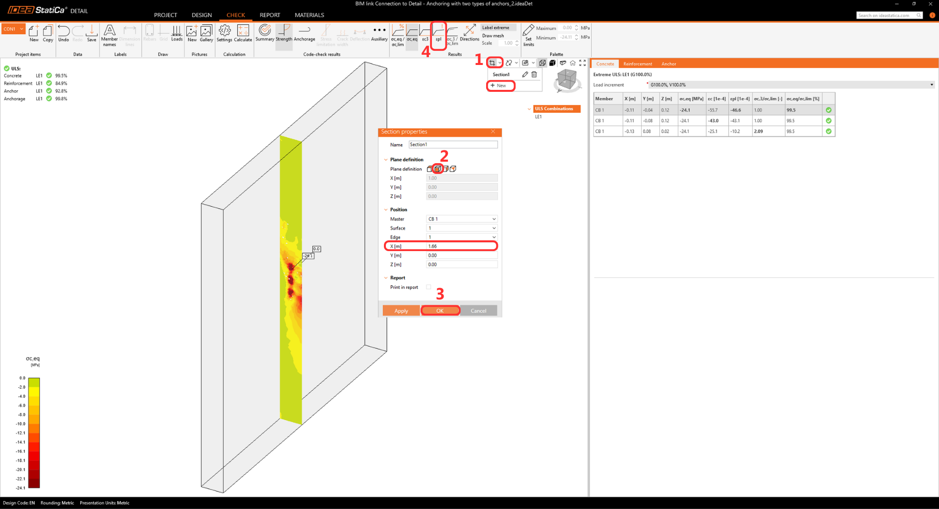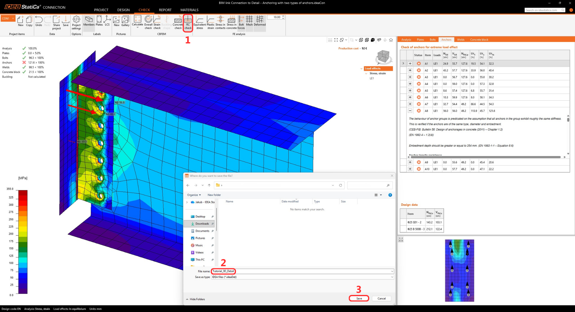 - The warning regarding insufficient embedment depth appears because this tutorial represents a real-world example with a thin wall and shallow anchors. The design's structural integrity is proven further in the Detail app.