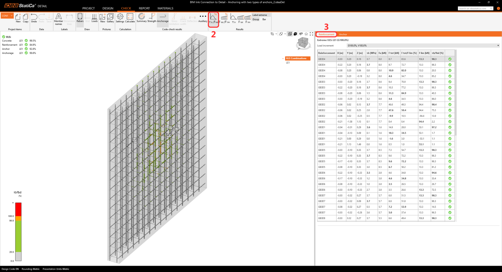 The Anchorage tab verifies the bond strength between the reinforcement and concrete. It ensures that the provided anchorage length is sufficient to transfer the forces. The check compares the actual bond stress (τb) with the ultimate bond strength (fbd) to prevent pull-out failure. You can display these results separately for Reinforcement and Anchors.