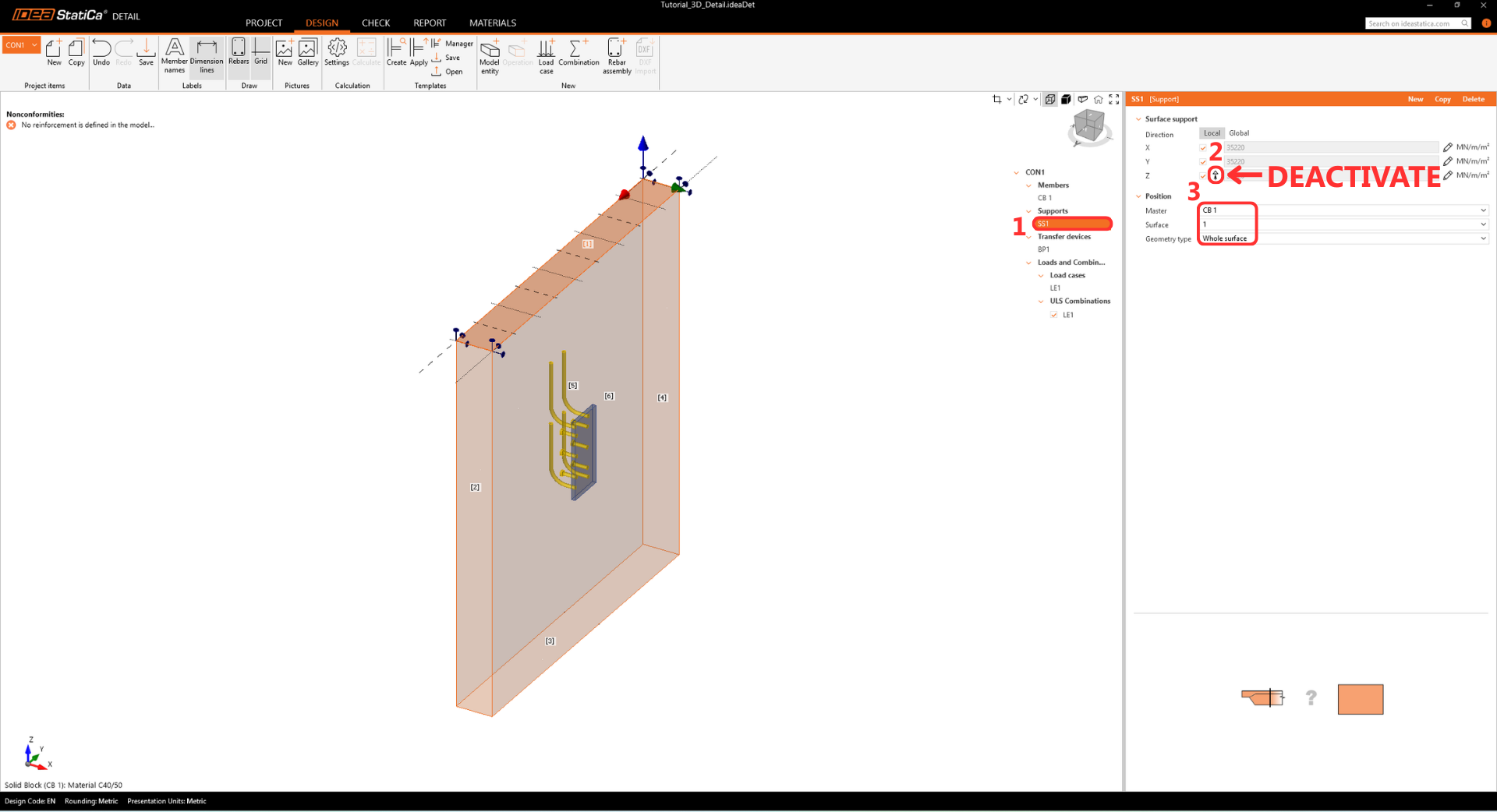 In this example, the connection is anchored to a wall that is continuous on all sides. For such submodels, we use rigid supports with continuous reinforcement. This setup simulates the wall's continuity, allowing tension transfer despite the compression-only settings, without requiring complex stiffness definitions.