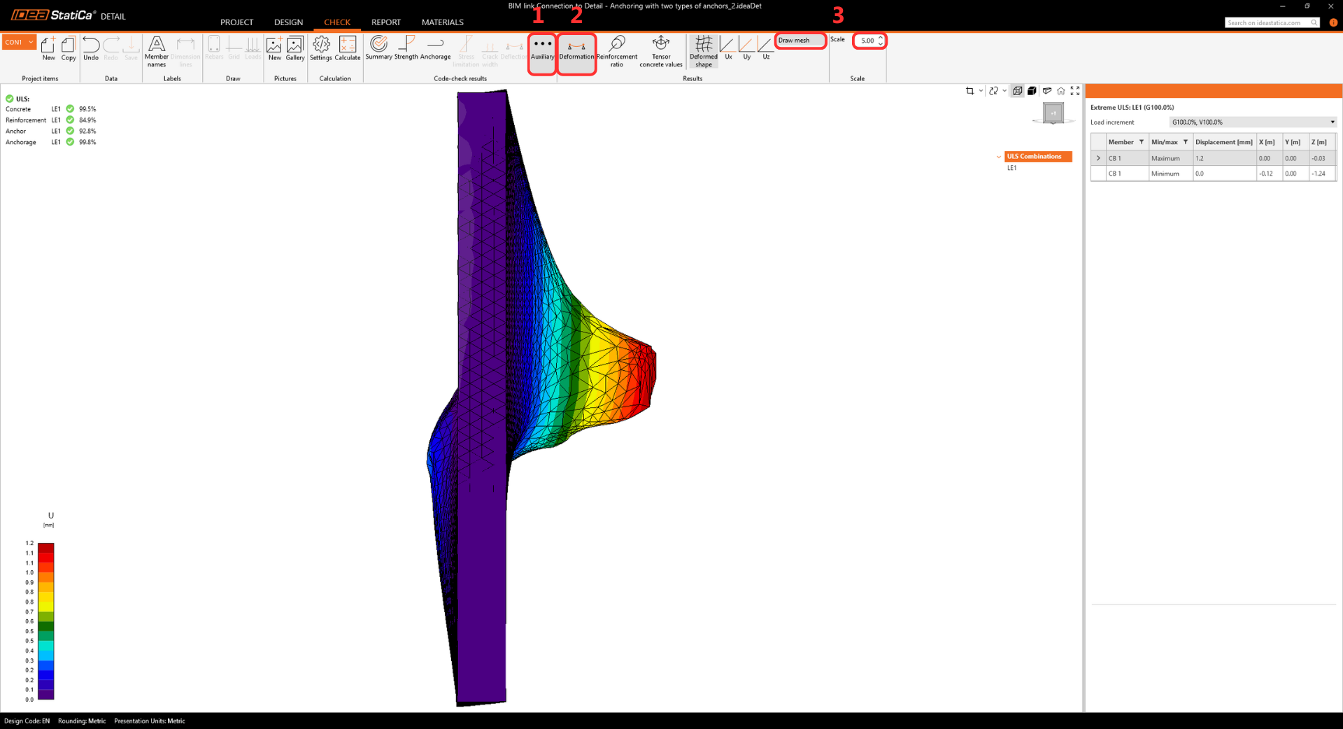 Switch to the Auxiliary tab and turn on Deformation. Although deformation limits are not prescribed for ULS (Ultimate Limit State), reviewing the deformed shape is a crucial sanity check. It ensures that the model is stable and not experiencing unrealistic displacements or rotations (e.g., due to disconnected elements). This visual inspection helps quickly identify any potential modeling issues.