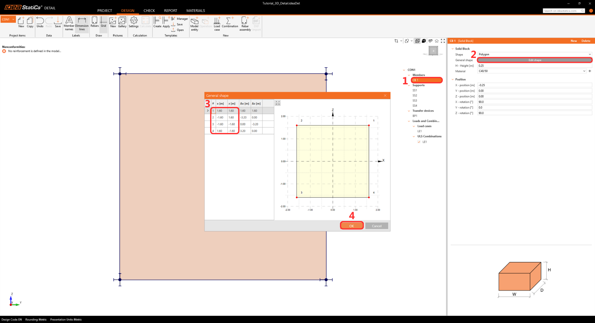 Let's increase the height and width of the concrete block. This provides a clearer view of the model and allows us to observe the complete stress profile along the rebars.