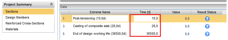 A few last steps hmust be performed for the correct code-checking of the composite cross-section. In “Section”, defining “Extremes” for each time the code-checking should be done is necessary. The defined times of extremes have to correspond to the times defined in “Construction stages” (chap. 2). Then correct values of internal forces for the calculation of the initial state of the cross-section will be taken from the tab ”Action stages”.