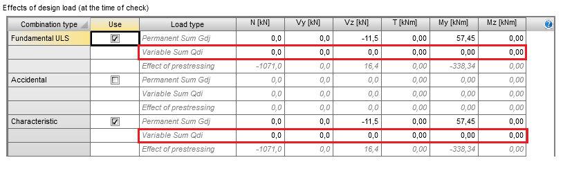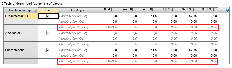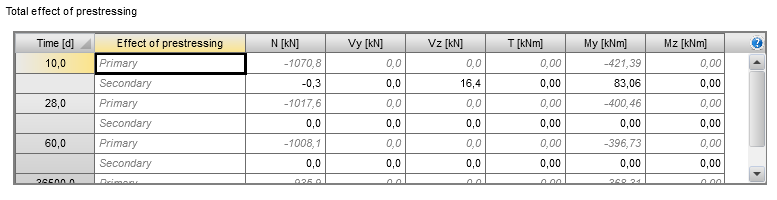 The summation of primary and secondary effects defined in the table shown above are automatically copied to the table in the section “Internal forces”. It is necessary to define prestressing carefully and correctly to prevent incorrect results.