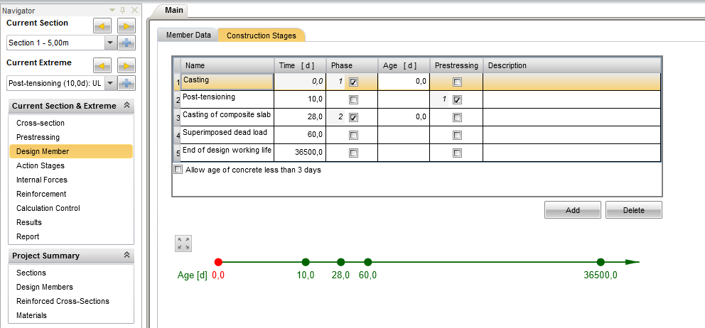 After defining the cross-section geometry and reinforcement layout, the timeline in the Construction Stages tab is defined. All important time points during the construction are defined (such as casting the first part of the cross-section of the precast beam, prestressing, casting the second part of the cross-section of the composite slab, superimposed dead load, and the time of the design working life). The defined construction stages are automatically propagated in the Action Stages tab.