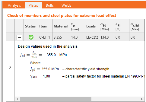 If the user wants to display and check the design values going into the analysis calculations, everything can be found in the result table for Plates. Simply click the 'plus' button to display more comprehensive information about the analysis, such as material reduction for hollow sections or specific steel parameters for stress-strain analysis, capacity design, fire design, or horizontal tying analysis.
