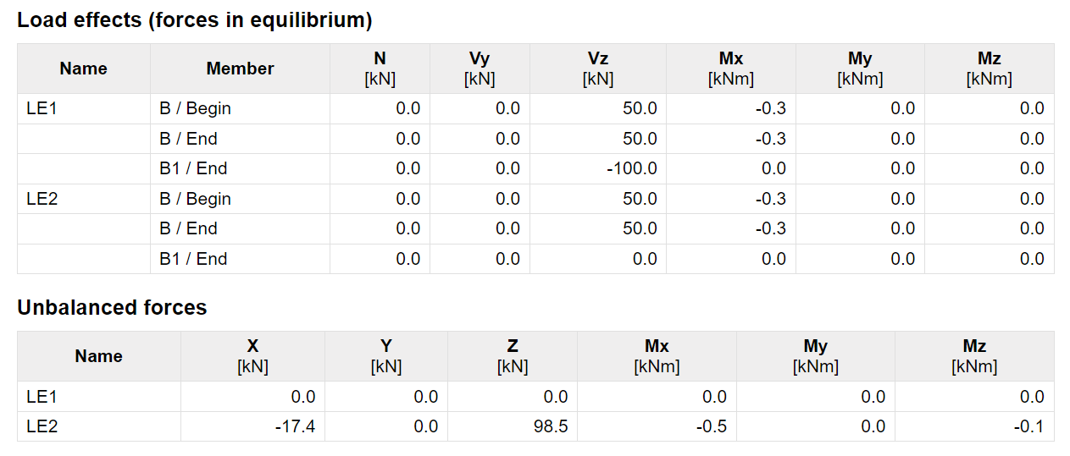 The loaded part of members (Begin/End), as well as the table of unbalanced forces, has been added to the table of applied load effects.