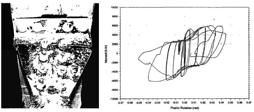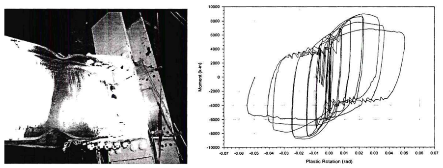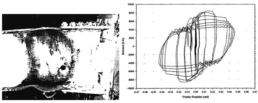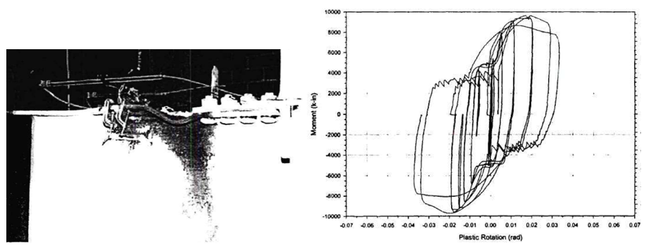 Figure 5.7: Left) Variation 1 after testing; Right) moment-total plastic rotation relationship (Lee et al., 1999)