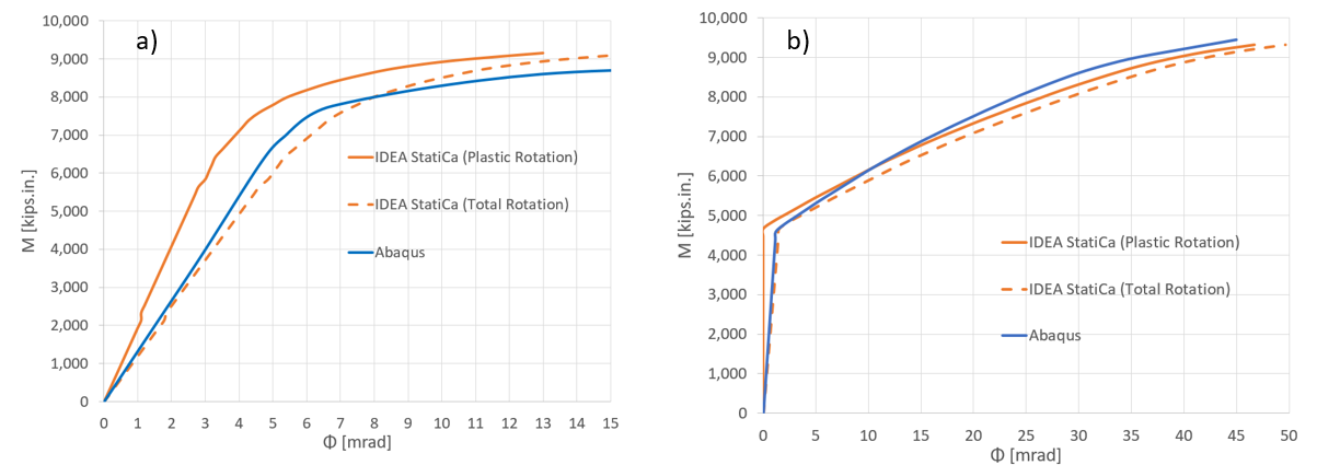 Figure 5.27: Moment-rotation comparison between IDEA StatiCa and ABAQUS for a) bearing type bolts, b) friction type bolts