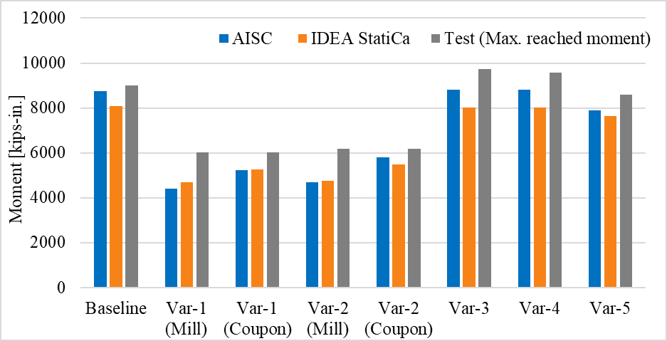 For variation 3, variation 4 and variation 5, the failure mode observed from the tests, AISC design procedure, and IDEA StatiCa analyses was the beam failure. Since the local buckling occurred during the cycle loads, no clear strength capacity was captured from the experiment. Although the specimens satisfied the buckling requirements (see Appendices I and J), the reason local buckling occurred during the experiments can be attributed to the inaccurate measured material properties provided in the test report. The calculated moment capacities using IDEA StatiCa and following AISC design procedure and the maximum reached moment values during the experiments are shown in Figure 5.29.