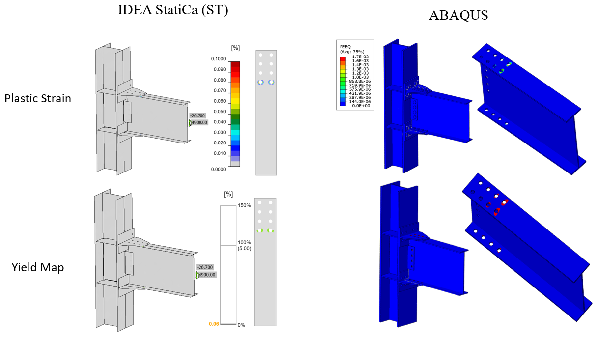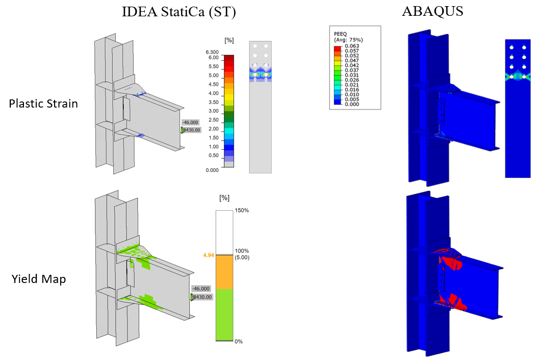 The maximum calculated plastic strain in IDEA StatiCa and ABAQUS for the friction type bolts were 0.1% and 0.17%, respectively (i.e., both on the beam top flange around the front bolt holes as indicated in Figure 5.26). Also, the predicted plastic deformation region by IDEA StatiCa was consistent with the calculated yield map in ABAQUS (i.e., the bottom row in Figure 5.26).