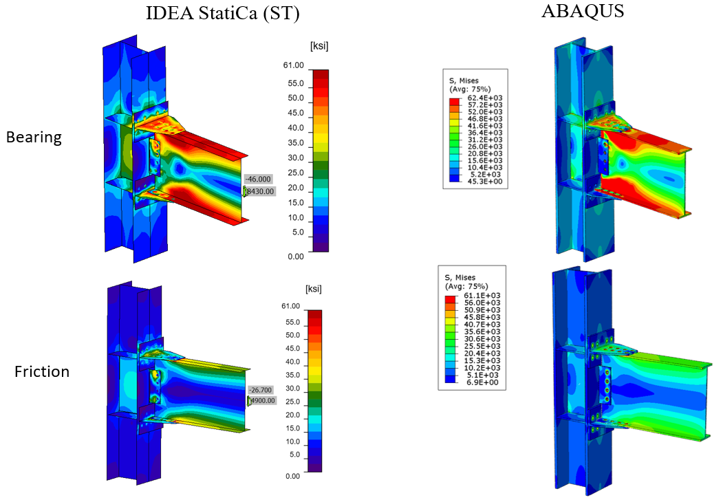 The maximum predicted stress in IDEA StatiCa for the bearing type bolts was 62.4 ksi on the beam top flange (note that the IDEA StatiCa legend shows the design data) while the ABAQUS model shows similar stress at the same location. The maximum predicted stress in IDEA StatiCa for the friction type bolts was 61 ksi on the beam top flange while the ABAQUS model shows the stress of 61.1 ksi at the same location. The slightly different stress distribution is likely due to the consideration of the length of the column in ABAQUS and the way that boundary conditions were applied, utilization of finer mesh in the FE analysis, and the simplified CAD model in IDEA StatiCa. Note that the authors also investigated the potential effect of frictional behavior of the bolts on the results in the ABAQUS model by changing the friction coefficient from 0.3 to frictionless, however, the results were not sensitive to that parameter.