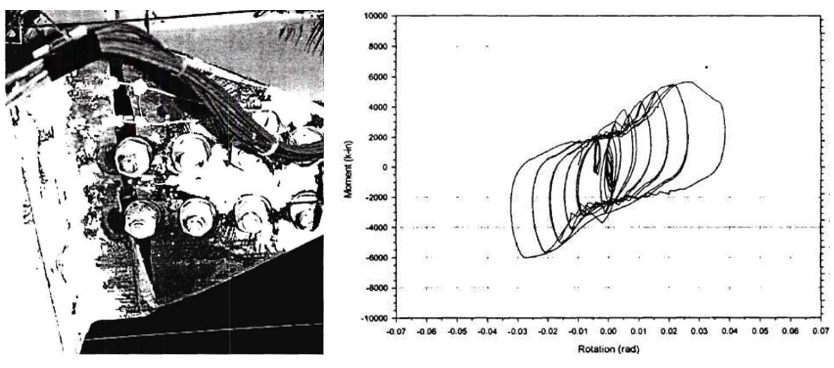 Figure 5.11: Left) Variation 5 after testing; Right) moment-total plastic rotation relationship (Leon, 1999)