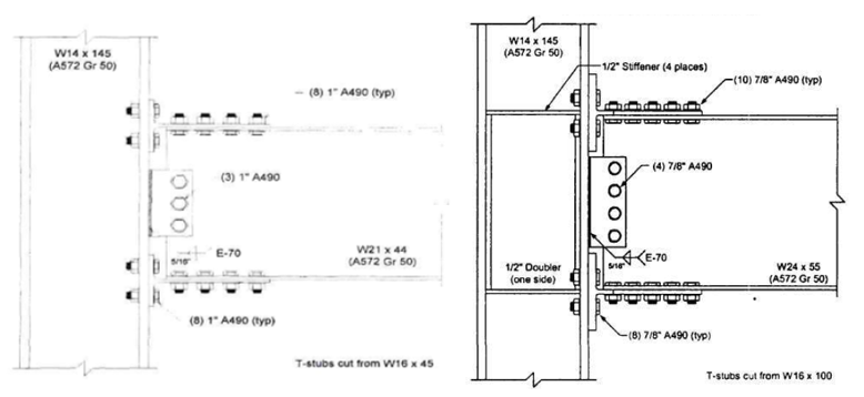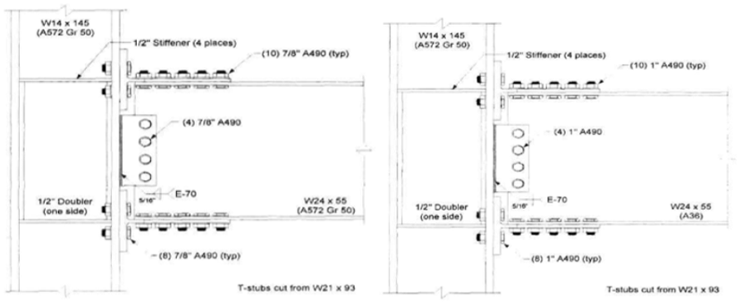 Variation 2 consists of 1 in. diameter A490 bolts differently from variation 1. All other details are identical to variation 1. The configuration of the variation 2 is illustrated in Figure 5.4. Variation 3 consists of a W14×145 column, a W24×55 beam and T-stubs cut from a W16×100. Ten 7/8 in. diameter A490 shear bolts and eight 7/8 in. diameter A490 tension bolts are used in both T-stubs. Four 7/8 in. diameter A490 bolts are used to fasten the shear tab and beam web while 5/16 in. double fillet weld is used between the column flange and the shear tab. Four ½ in. thick continuity plate and ½ in. thick one-sided doubler plate is used to reinforced the column panel zone. The differences between the baseline model and variation 3 are the diameter of the bolts and the number of shear bolts used to fasten the T-stub flanges and the beam flanges (see Figure 5.4).