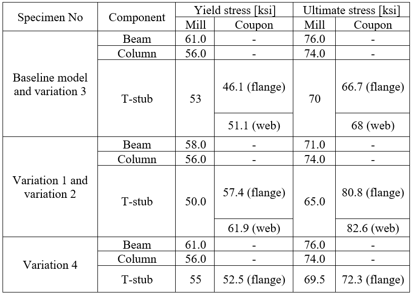 It was assumed that shear tab, doubler plate and continuity plate had identical measured material properties with T-stub. The nominal tensile strength (fnt = 90 ksi) and shear strength (fnv = 68 ksi) values provided in AISC Table J3 were used for A490 bolts. Five models were developed using mill certificate material test reports for each specimen. Two additional models were developed for variation 1 and variation 2 using coupon material test properties measured for T-stub. Design checks were performed for the selected specimens, and the summary is presented in Table 5.3.