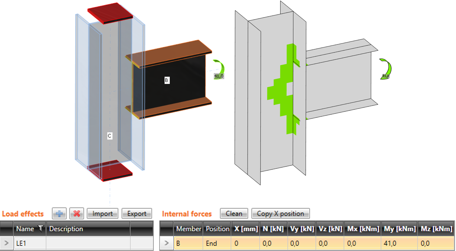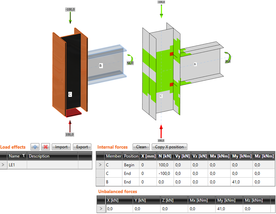 The difference between the modes is shown in the following example of T-connection. The beam is loaded by the end bending moment of 41 kNm. There is also a compressive normal force of 100 kN in the column. In the case of simplified mode, the normal force is not taken into account because the column is supported on both ends. The program shows only the effect of the bending moment of the beam. Effects of normal force are analyzed only in the full mode, and they are shown in the results.