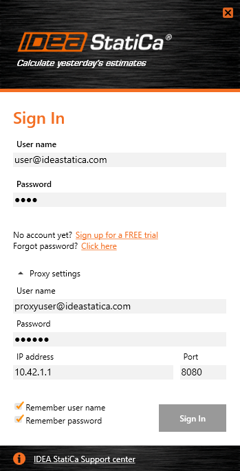 Set up the proxy settings in the license dialog. Please keep in mind that the proxy user name and password are not the same as IDEA StatiCa credentials. Please confirm with your company IT administrator.
