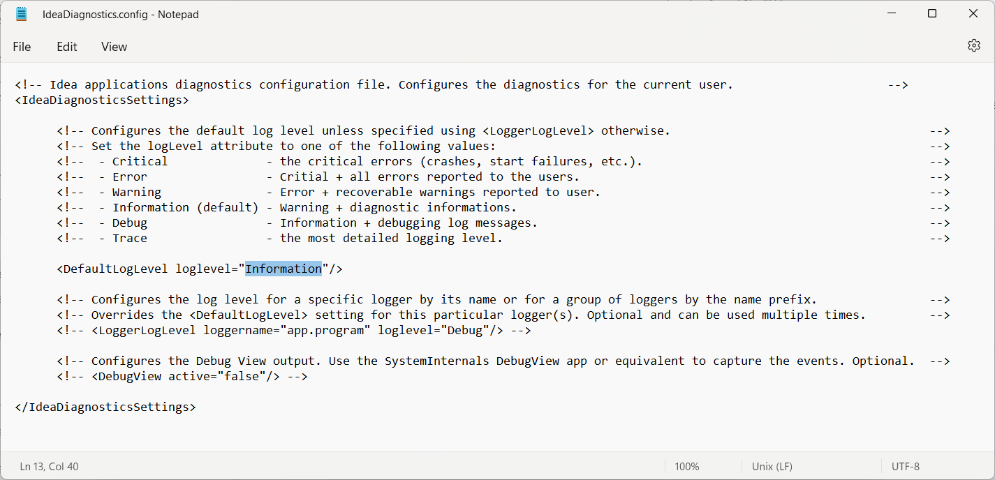 Open the IdeaDiagnostics.config file and change the severity level of messages in the log file (change the parameter in " " brackets in the DefaultLogLevel loglevel= line.