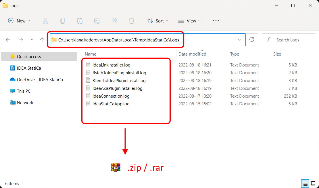 In the Logs folder, you can find several log files generated during different actions made in IDEA StatiCa applications. Please put all of them into one archive file (either .zip or .rar) and send them to us via the User Portal (or your local reseller who provides the support to you).