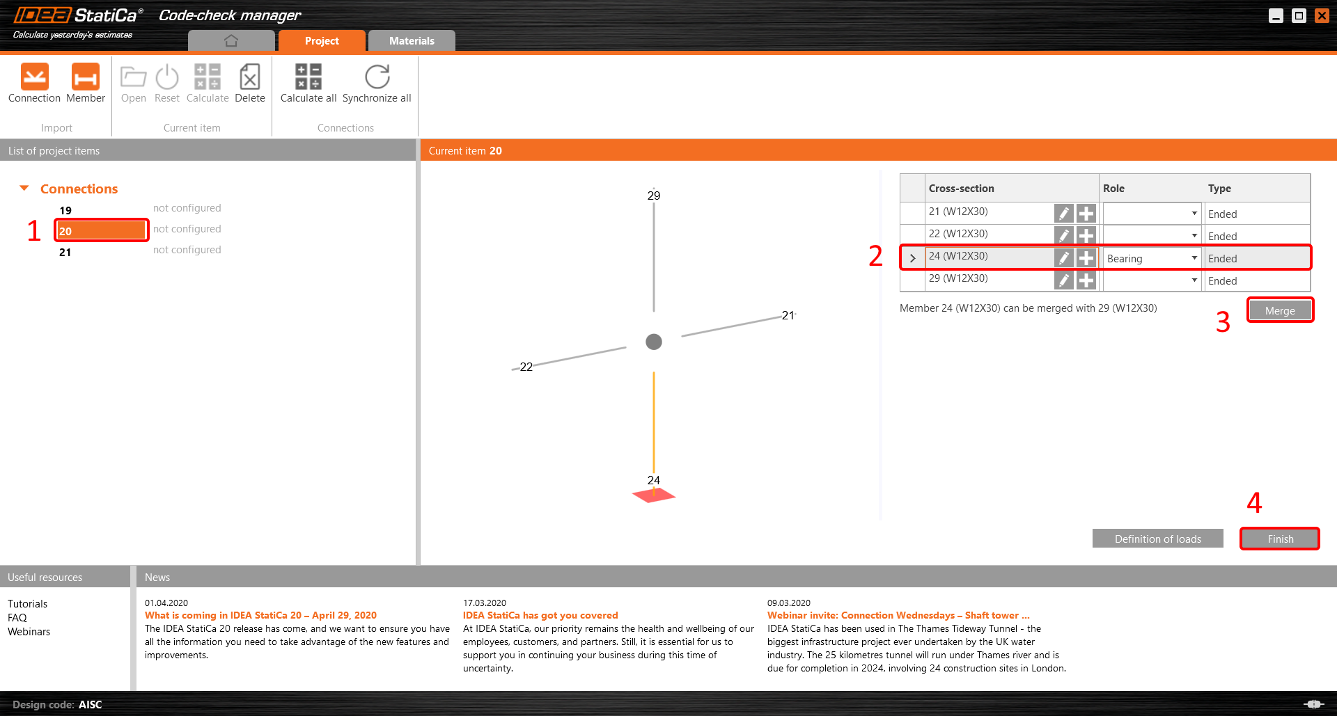 You click on the joint on the left side (joint  20). On the right side, you can see the scheme of the joint, you can set the bearing member and merge the continuous members. After that, click on the Finish button to complete the configuration of the joint.