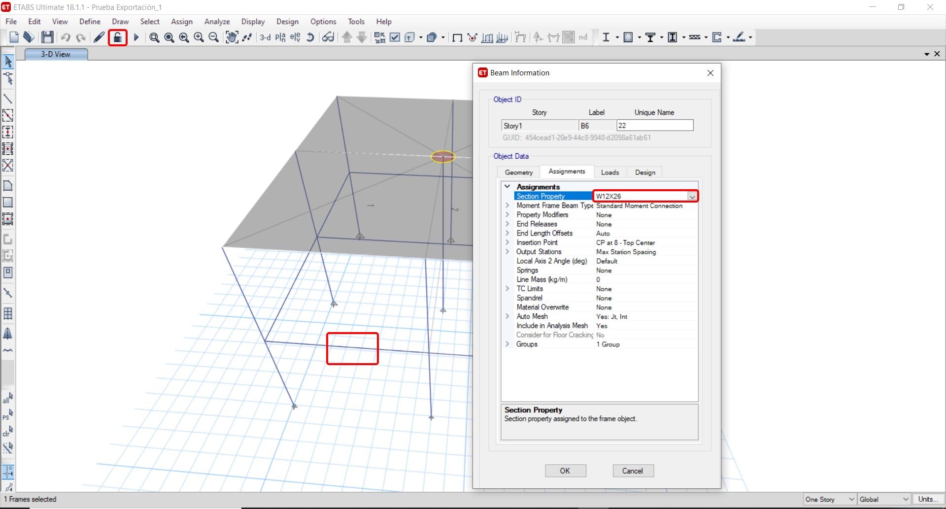 Unlock the model and change the cross-section of member 22 from W12x30 to W12x26.