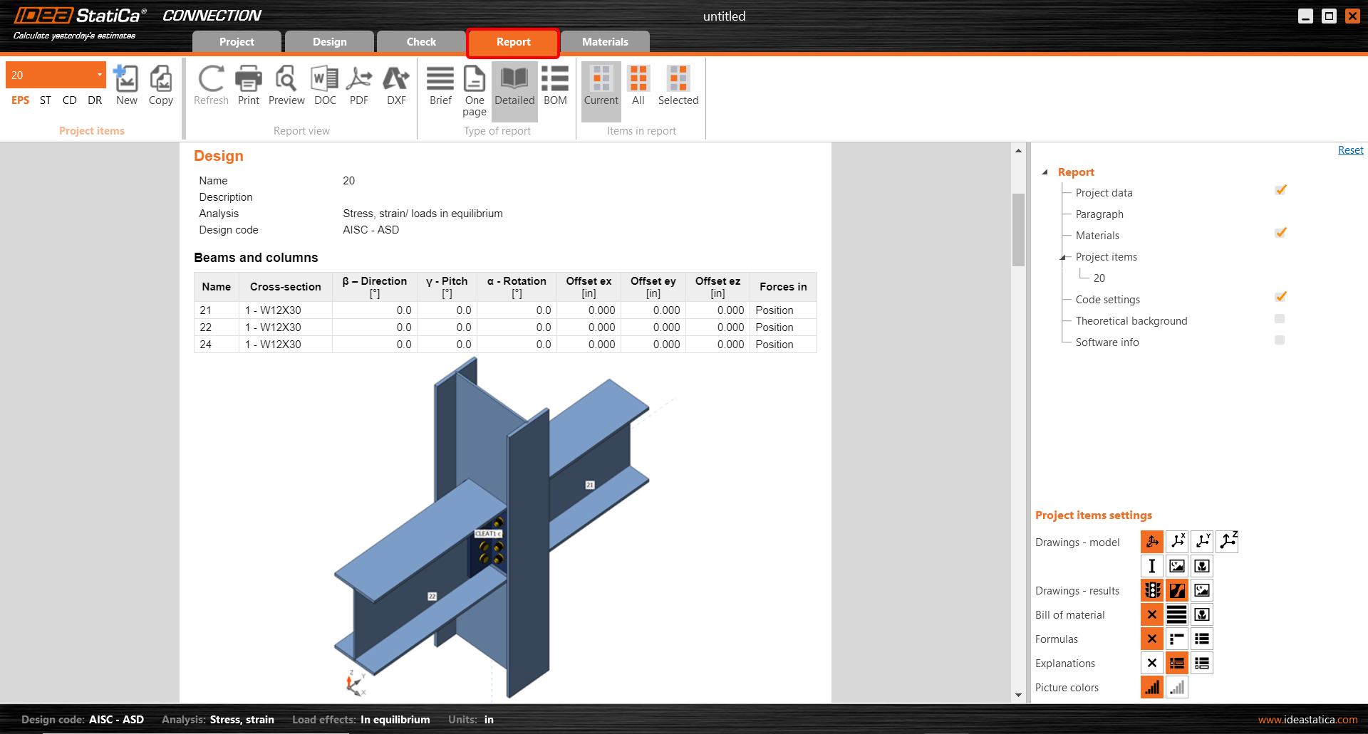 At last, go to the tab Report. IDEA StatiCa offers a fully customizable report to print out or save in an editable format.