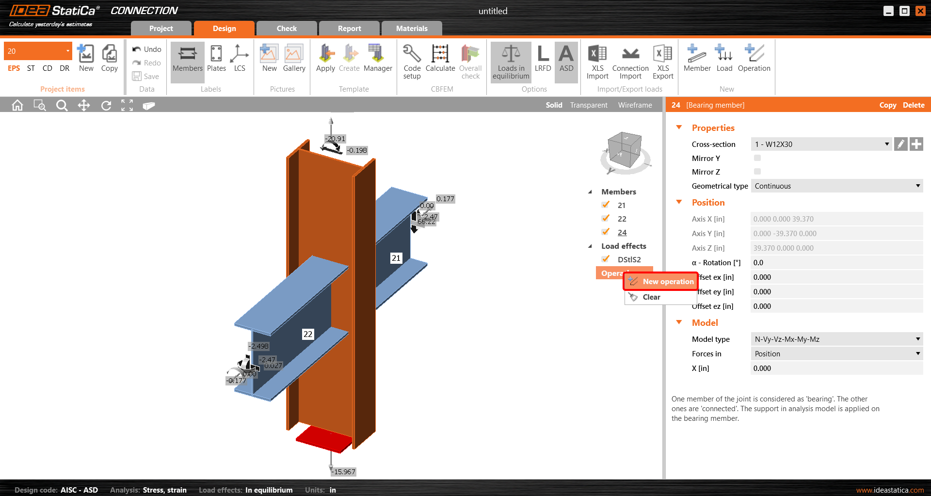 Now you will define a set of manufacturing operations to model the connection between members. In the items tree, you right-click on Operations and select the option New operation.