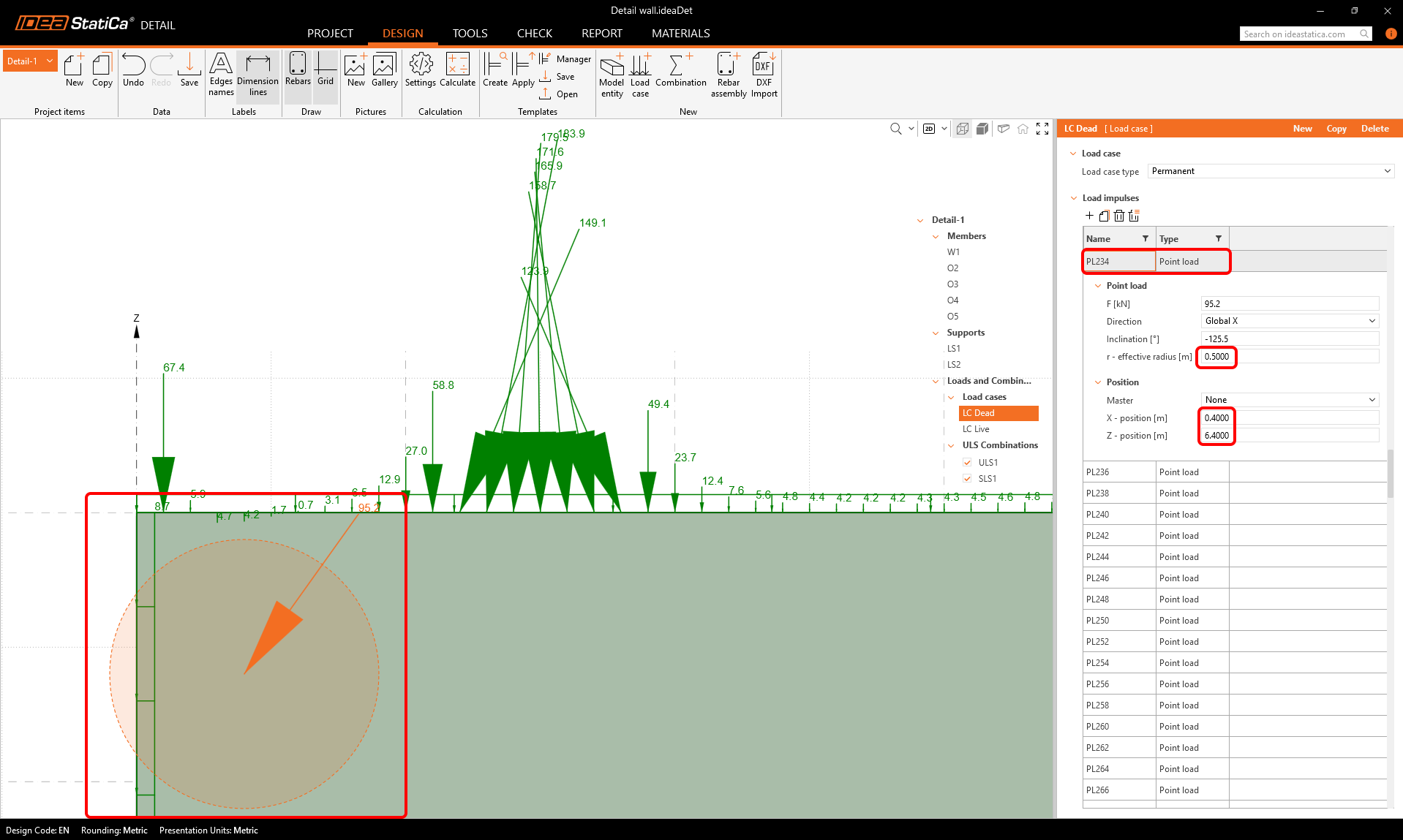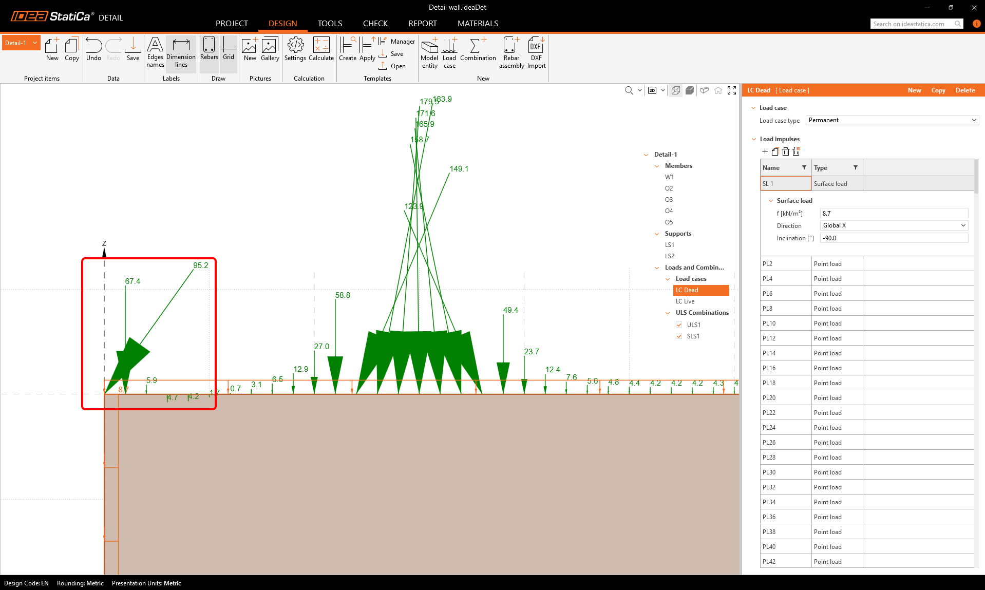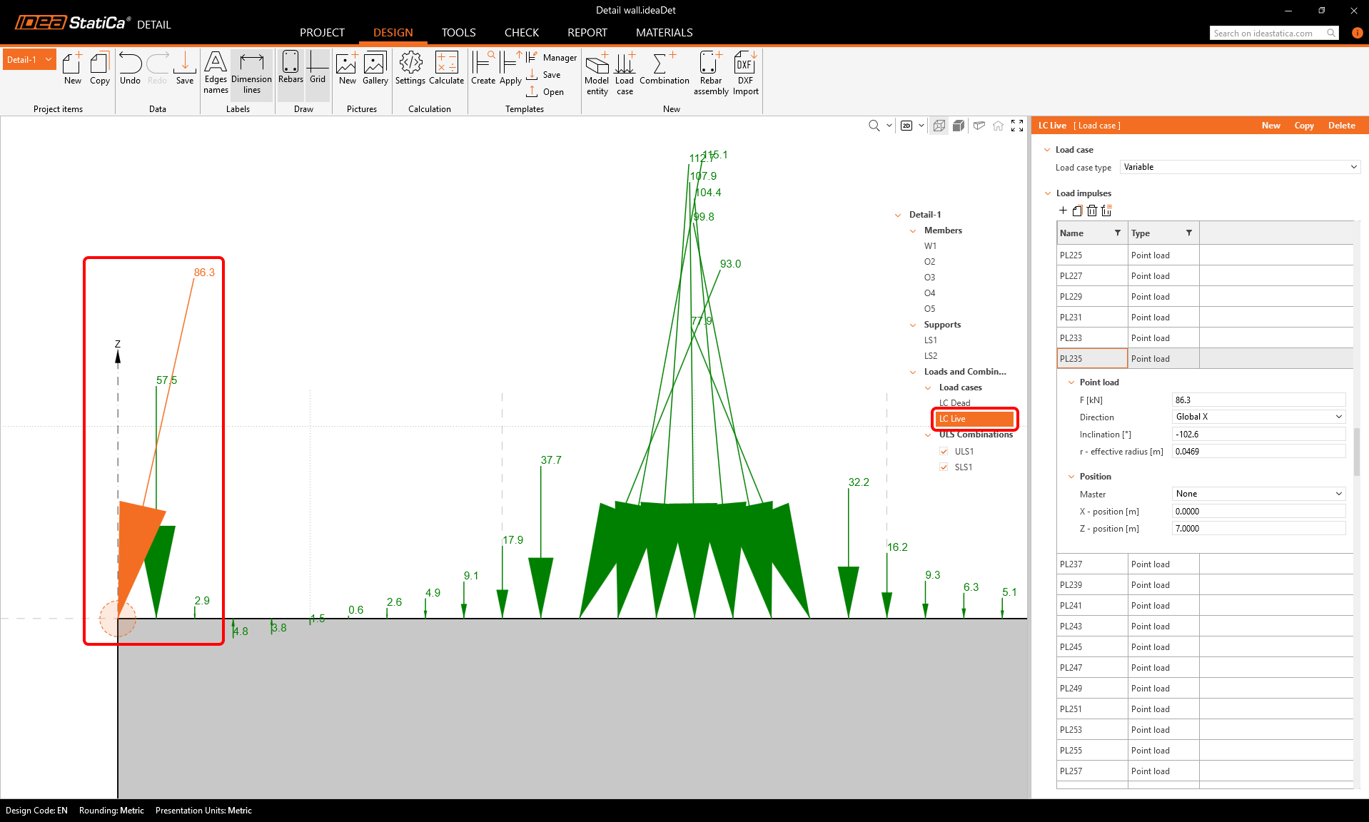 If we take a close look at the top left corner, we can see that there is a relatively large point load exactly on the corner of the concrete wall, directing outwards. Such a concentrated force placed on the corner could prevent the numerical calculation for converging, leading to unsatisfactory results.
