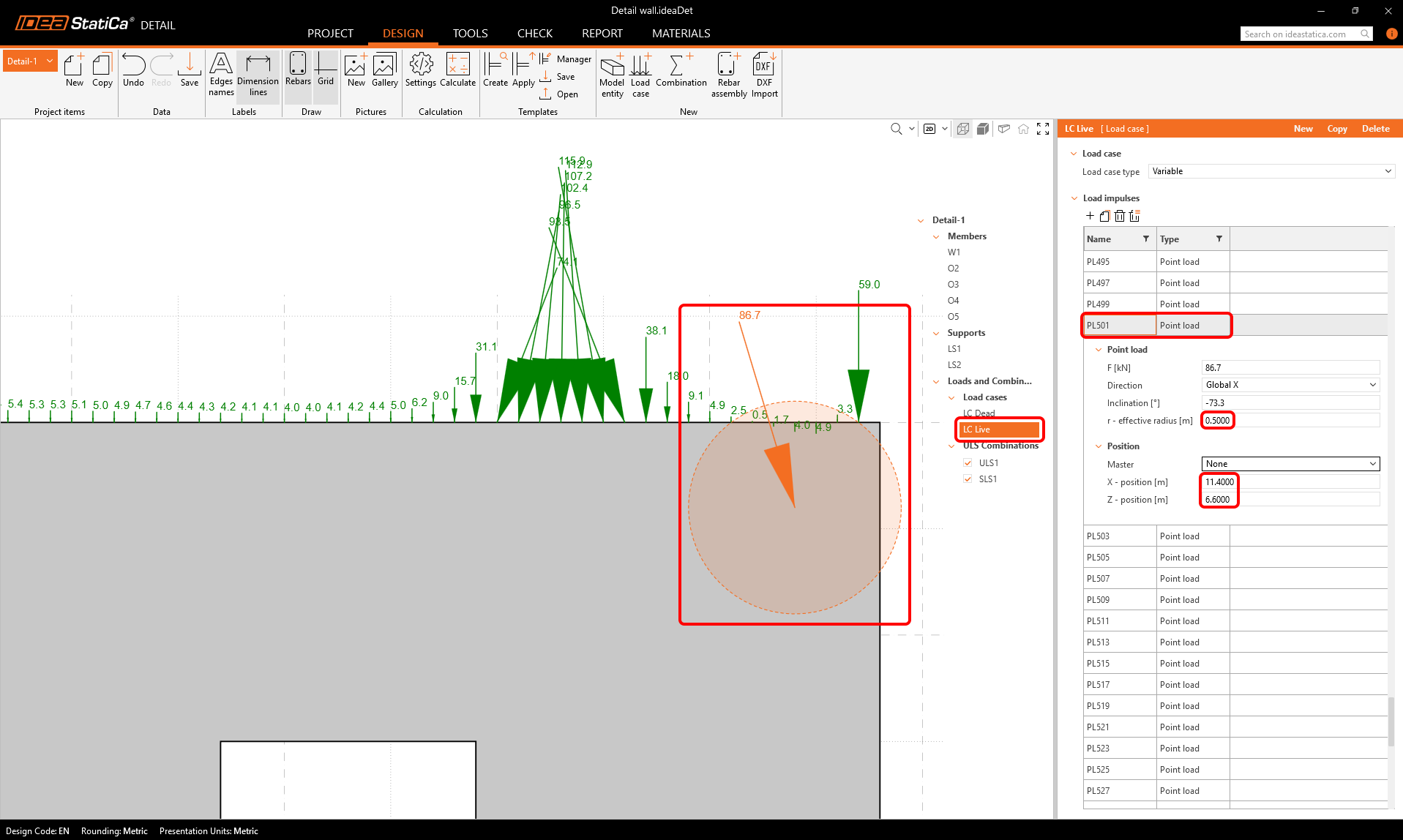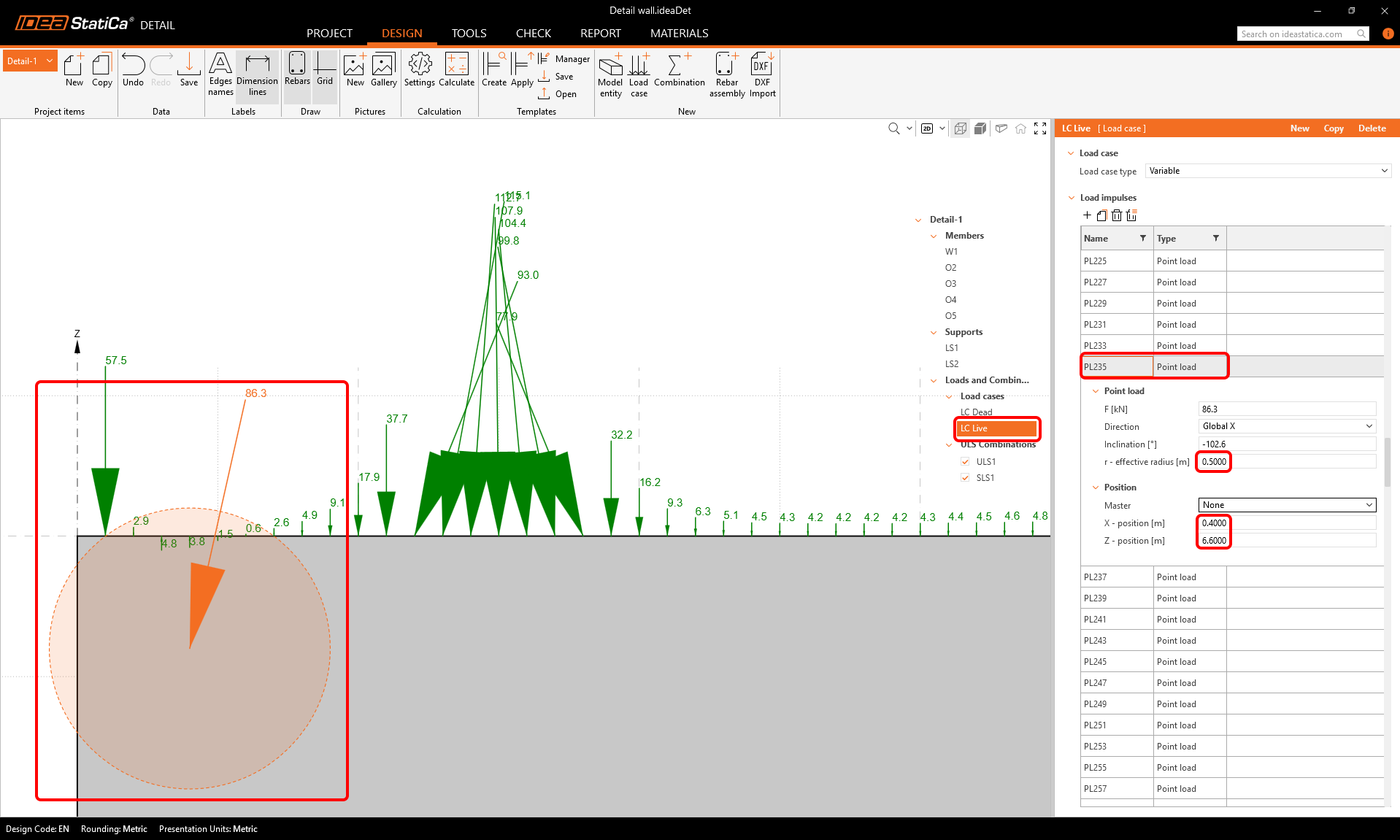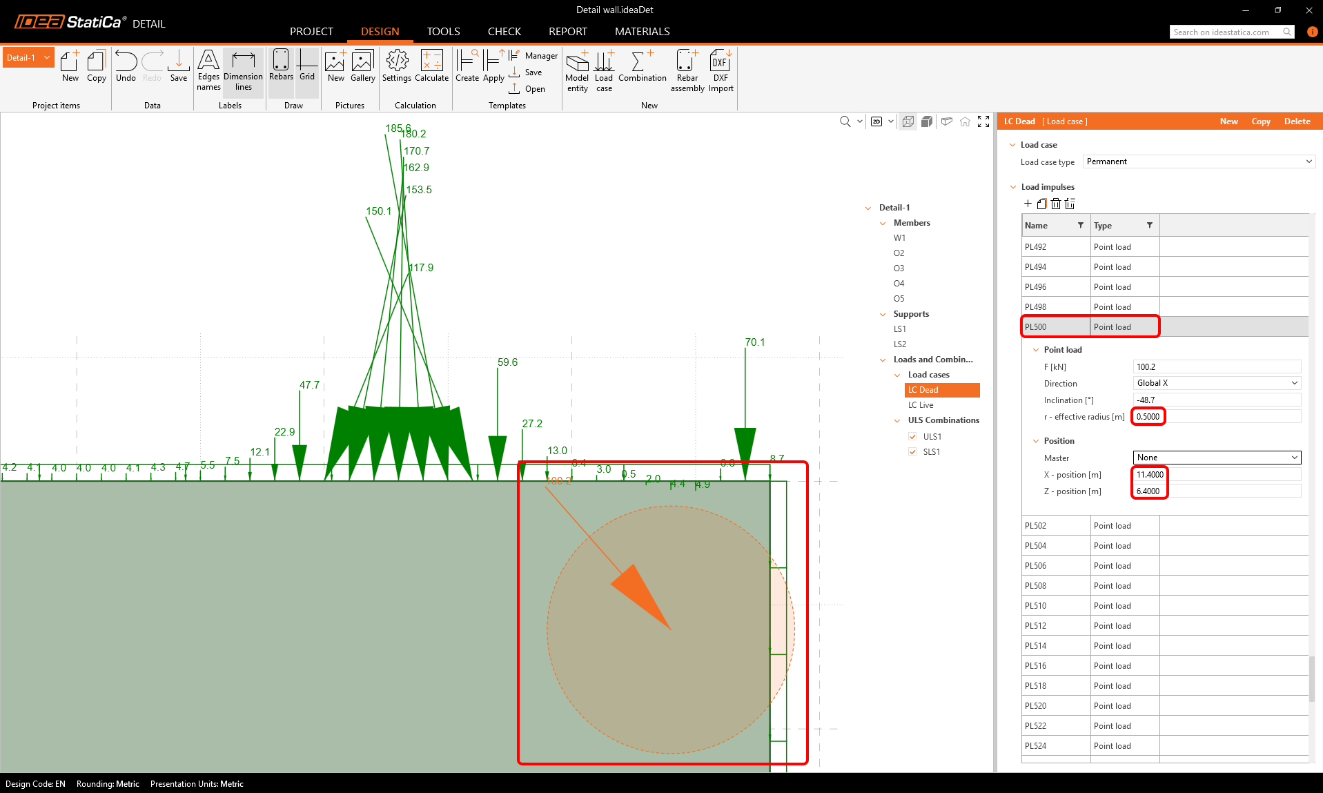 If we take a close look at the top left corner, we can see that there is a relatively large point load exactly on the corner of the concrete wall, directing outwards. Such a concentrated force placed on the corner could prevent the numerical calculation for converging, leading to unsatisfactory results.