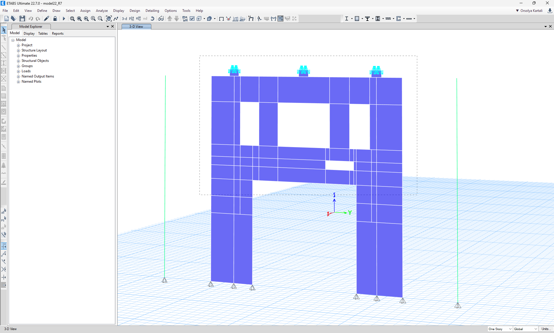 Let's add the supports first. Those need to be defined in correspondence with the global model. Click Model entity in the top ribbon, and select Line support.