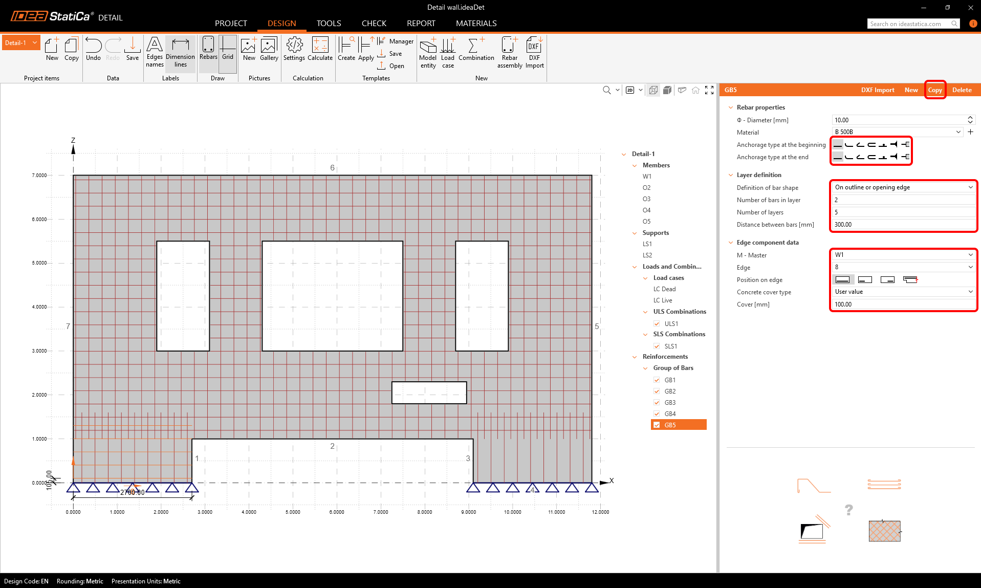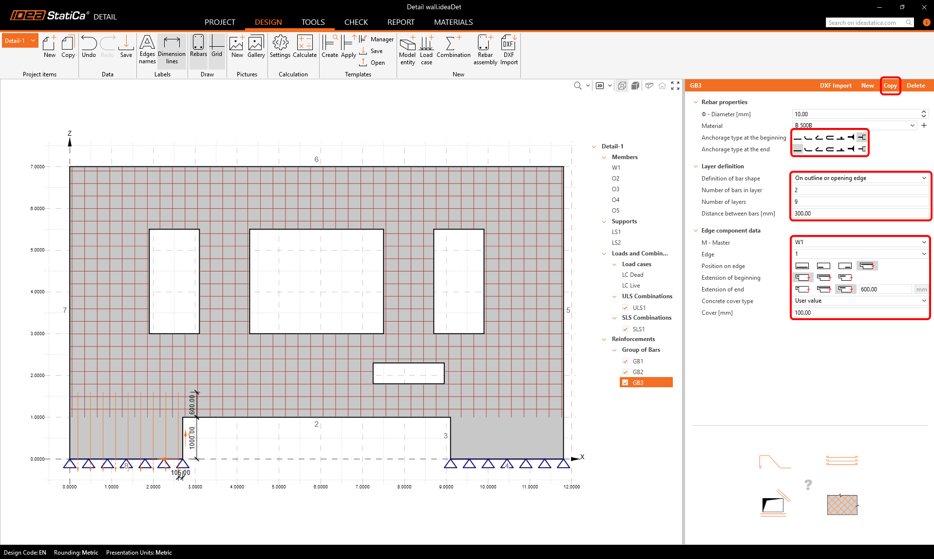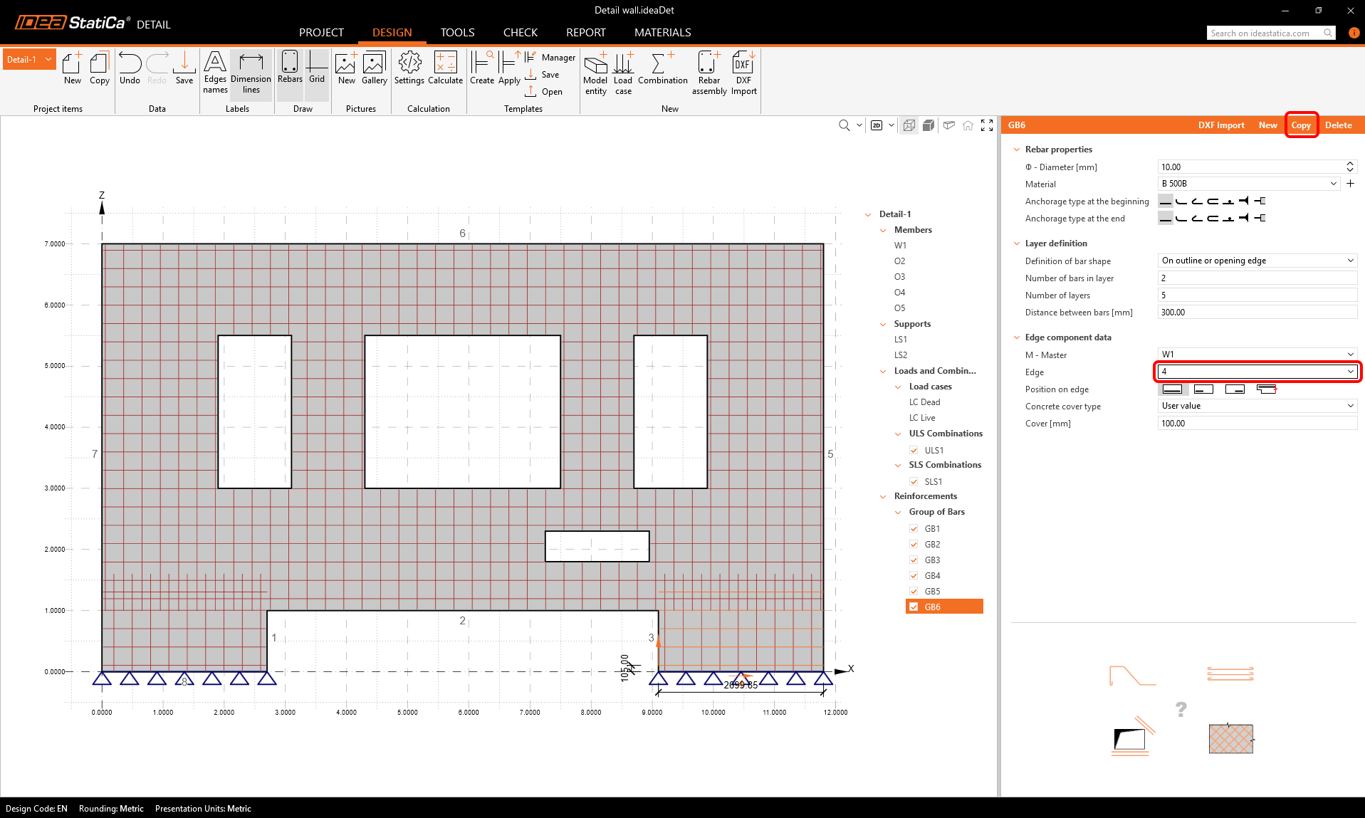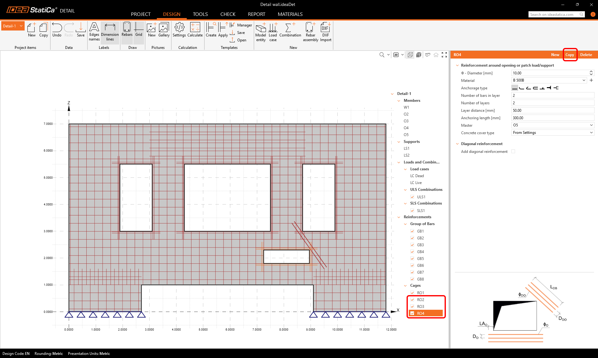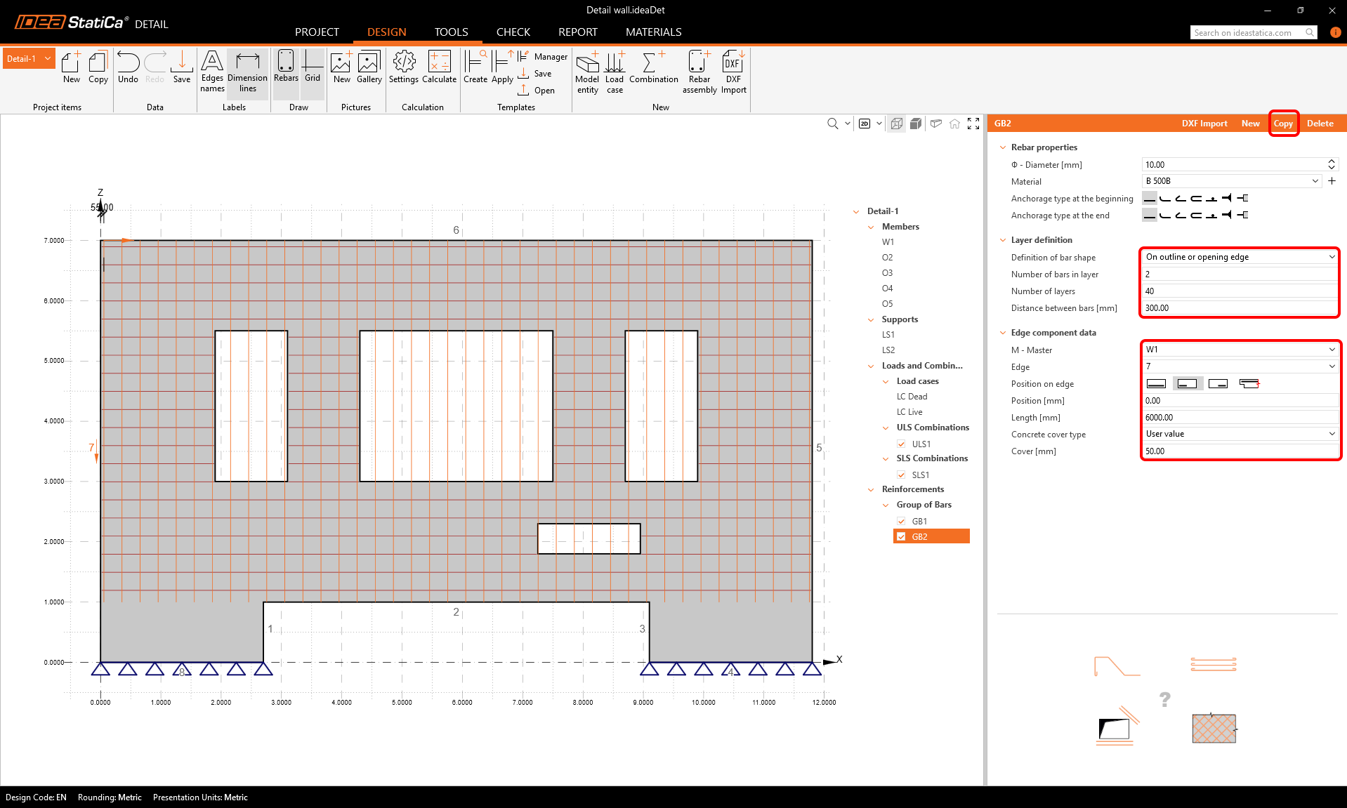 Use the copy button two more times to input horizontal reinforcement into the lower parts of the wall.