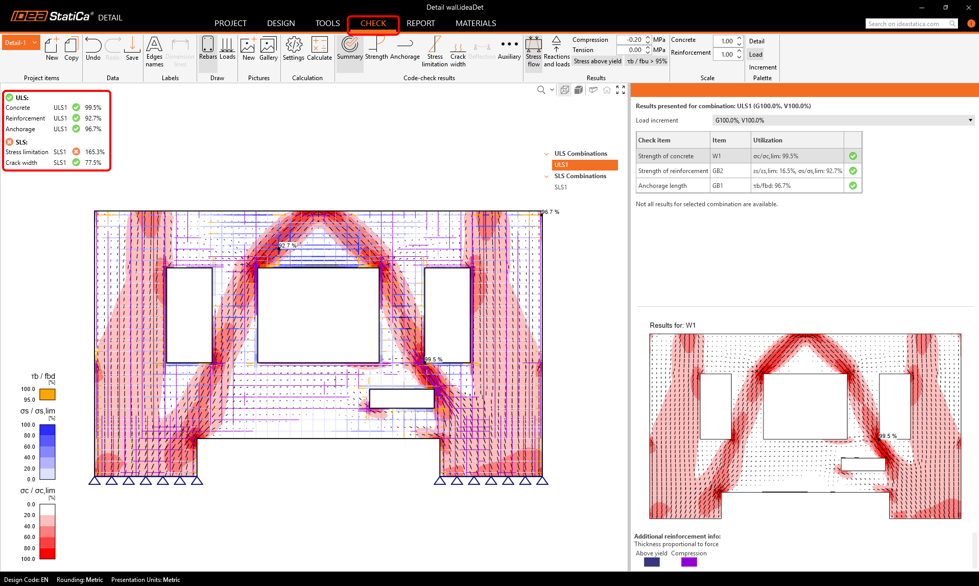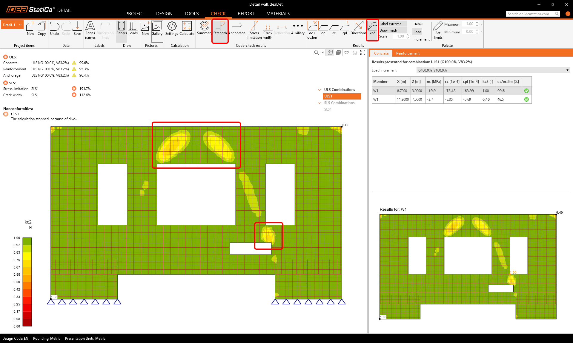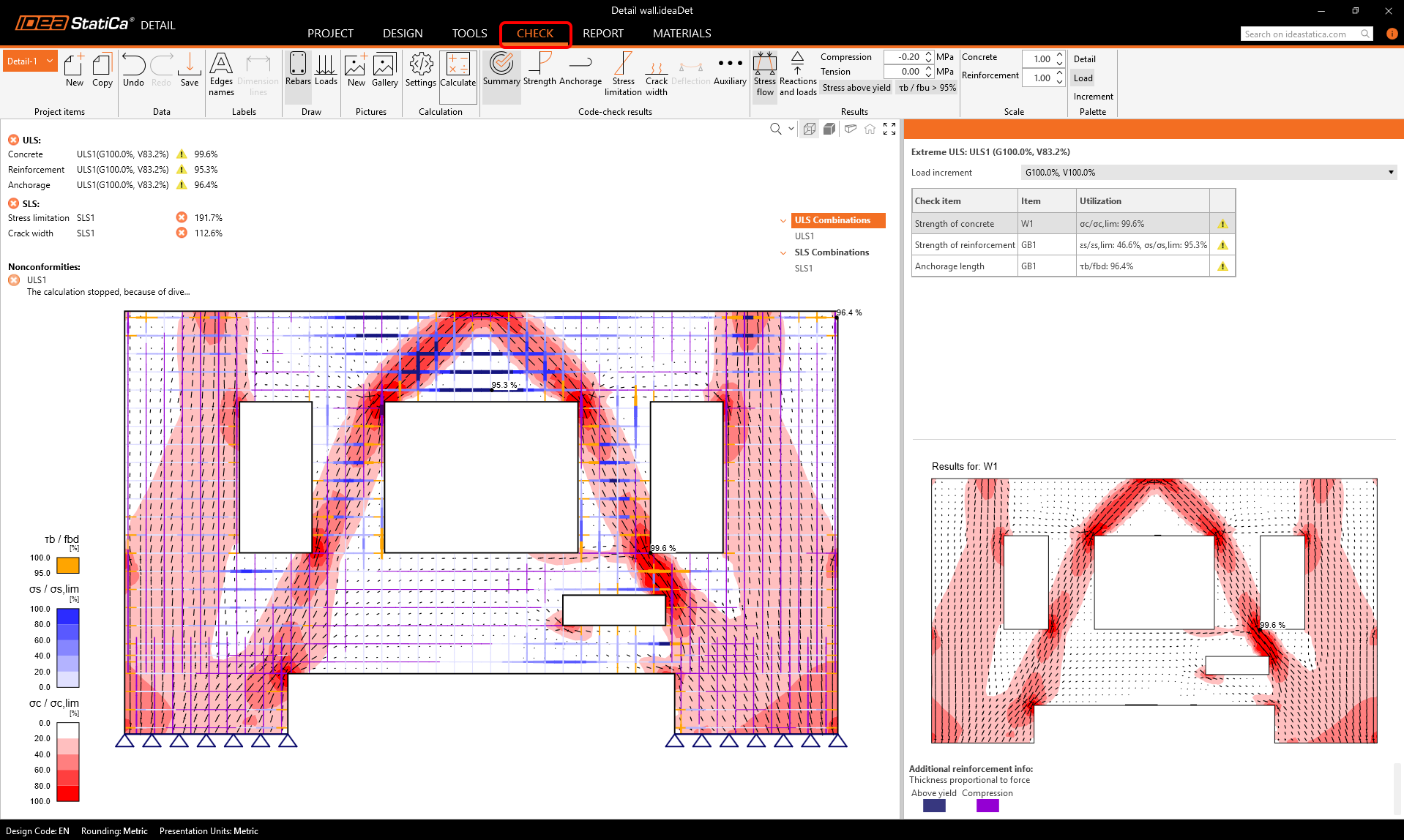 If we go to the Check tab, we can see the stress fields in the wall. There are some critical areas in concrete, where we can see big stress concentrations, marked with the red color.