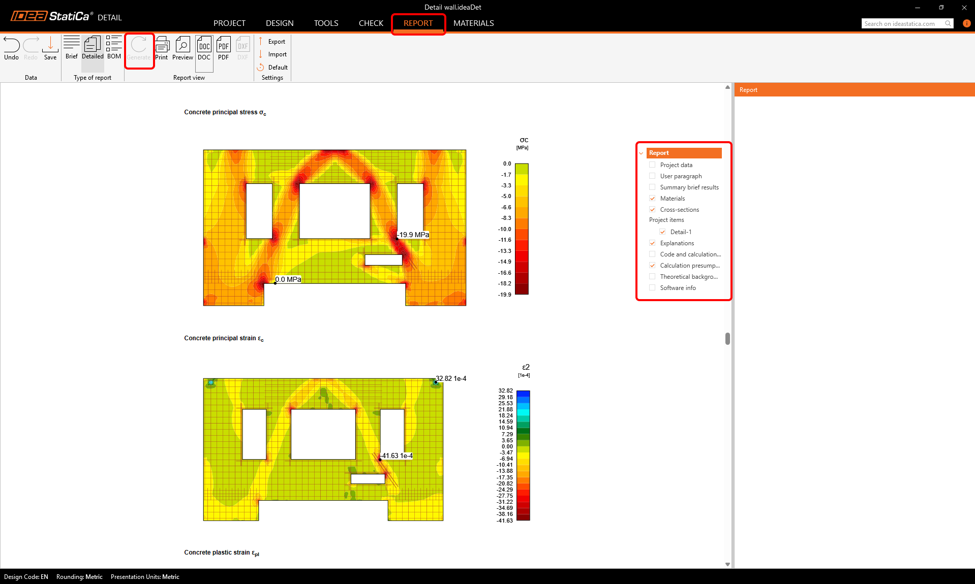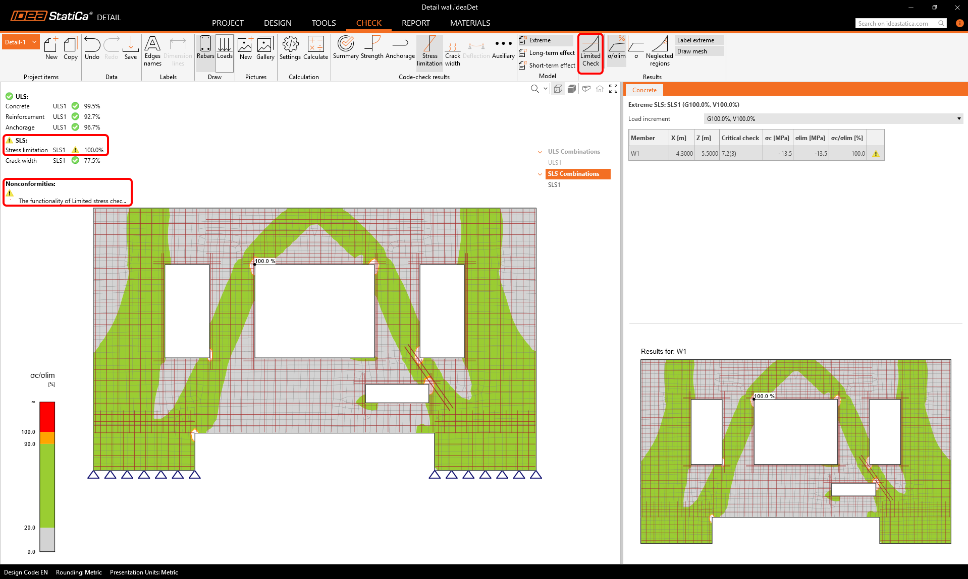 Because the stress in concrete exceeds the limit stress only in small regions around the sharp corners, we can turn on the Limited Check functionality in the top ribbon. In numerical calculations, it is typical that stress peaks (singularities) form around sharp corners. In such cases, we can exclude those areas from the code-checks. This means that we will see 100% results for the stress limitation check, completed with a nonconformity message that explains the usage of limited checks. Find out more about the Limited Check in this article.