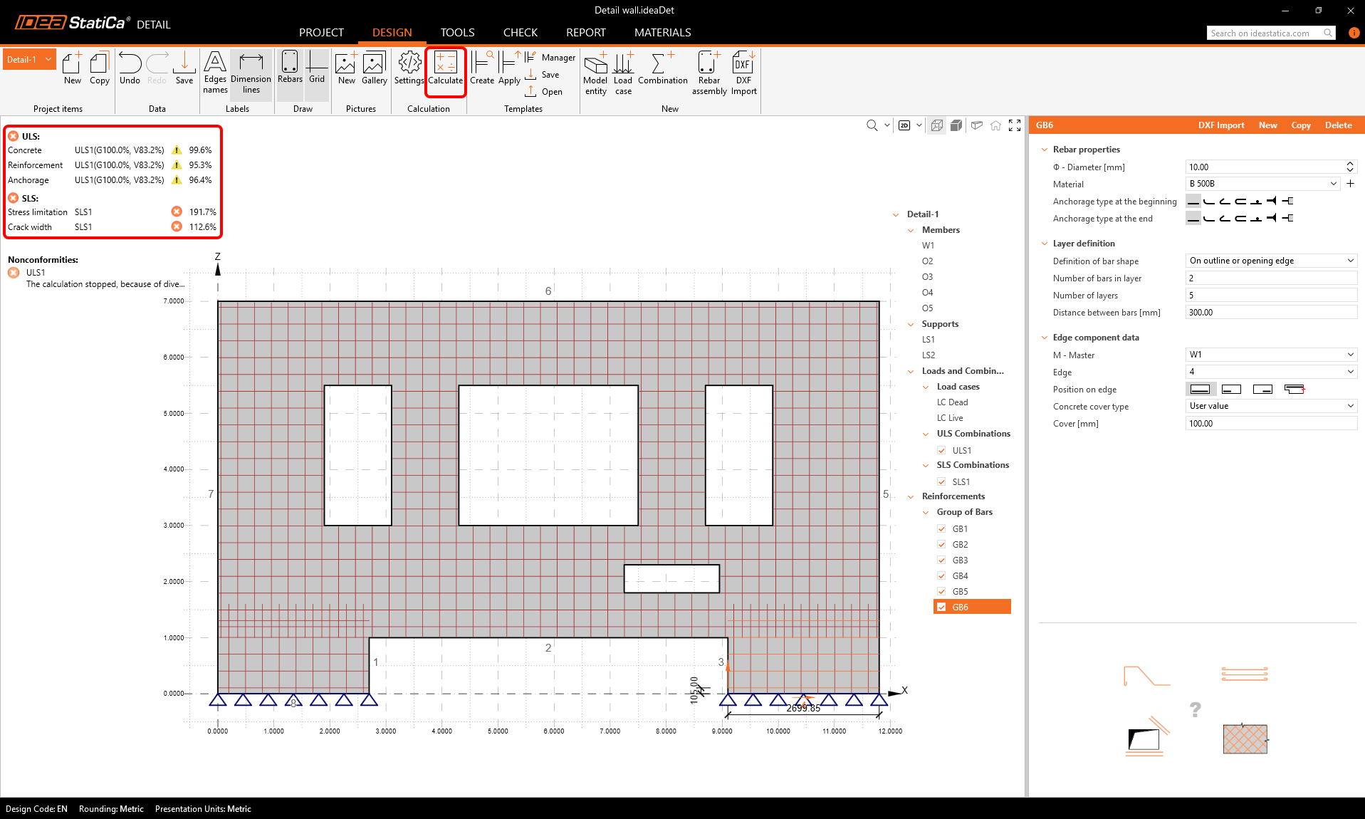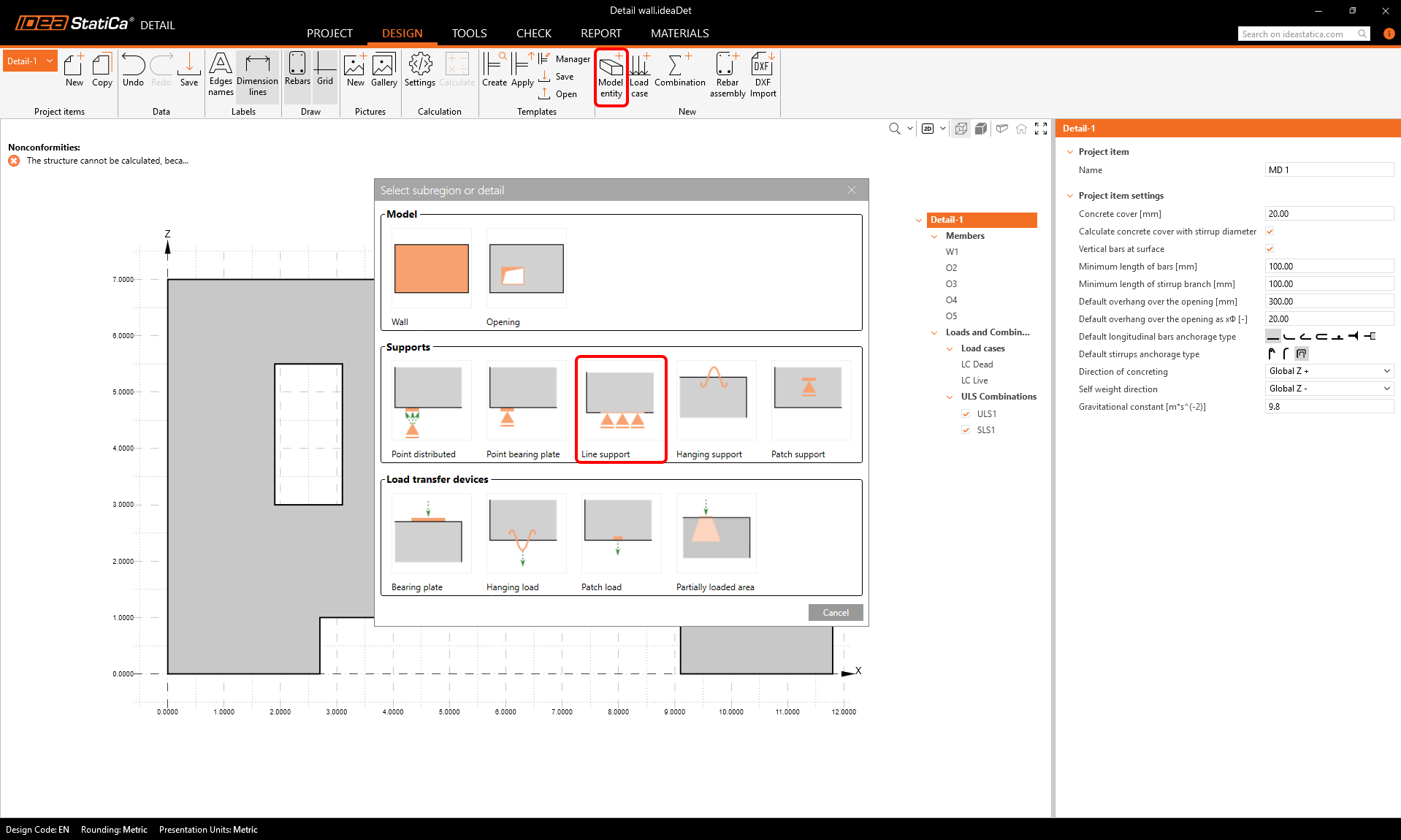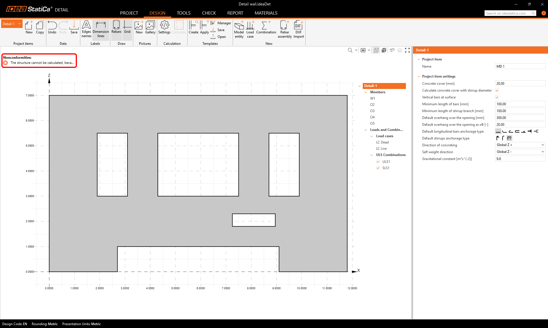 The exported Detail project opens automatically. We can see the following nonconformity message that says that the structure cannot be calculated because is has no supports. Also, we do not have any reinforcement in the wall yet.