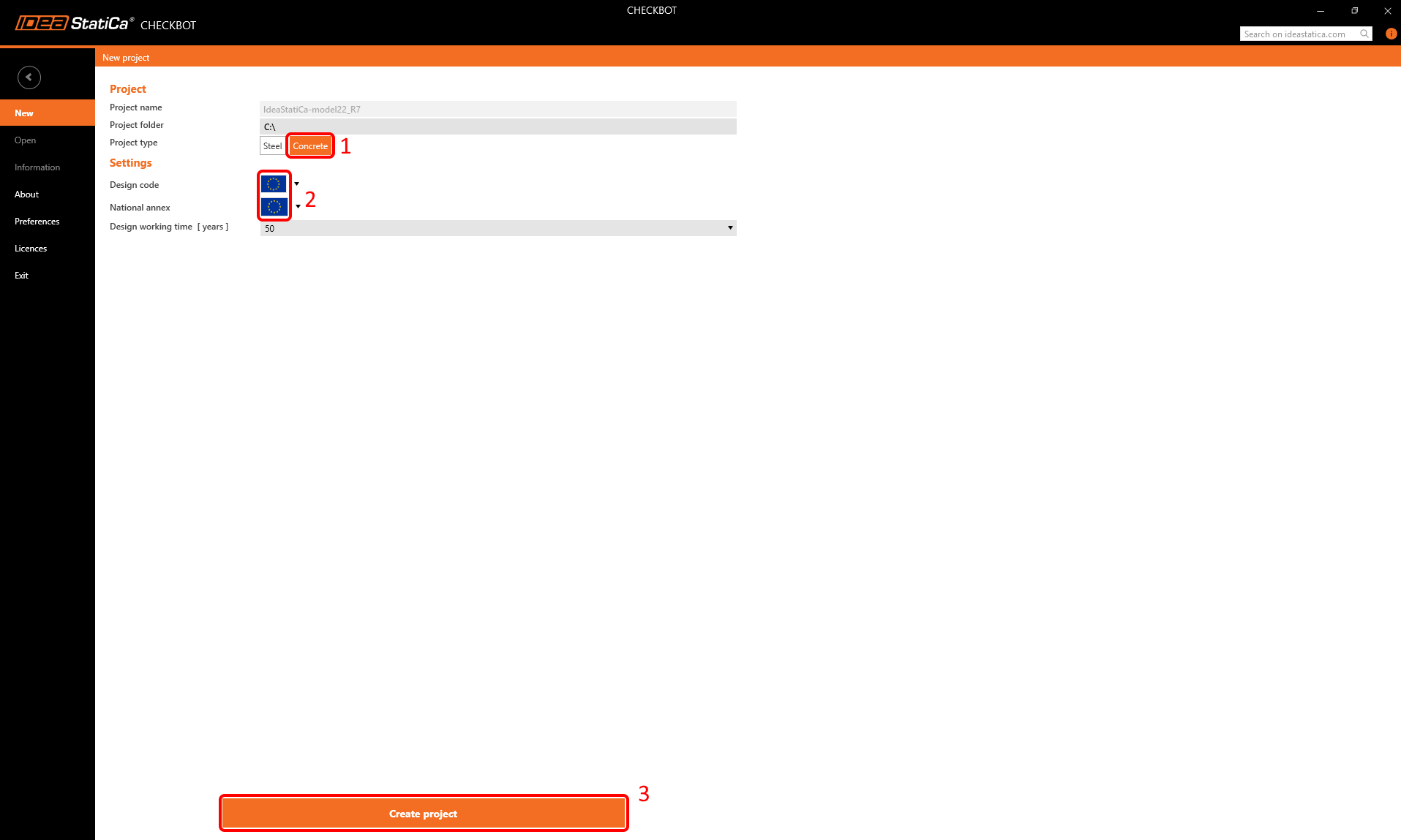 Once in the window of Checkbot, choose a Concrete project, and the design code you want to use – Eurocode in our case. Then click Create project.