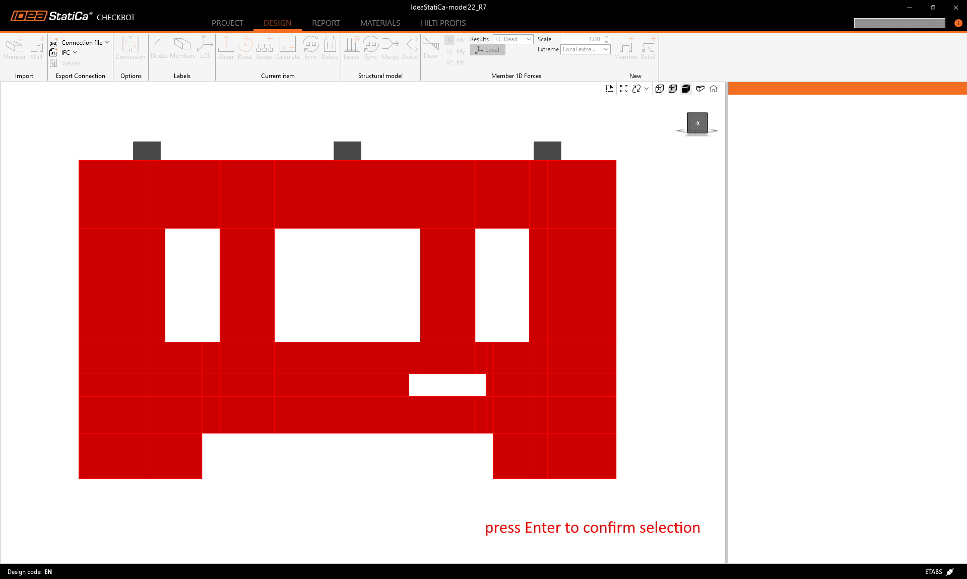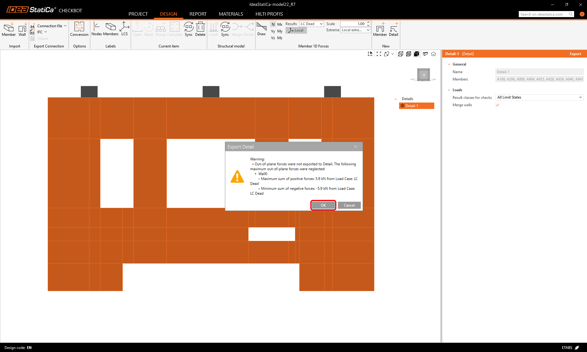During the export, the following warning message can appear. Be aware that IDEA StatiCa Detail 2D works with a vertical wall model and only calculates with in-plane loading. Any out-of-plane effects coming from ETABS will be neglected. The warning message contains the values of the neglected out-of-plane loads and the corresponding load cases as well.