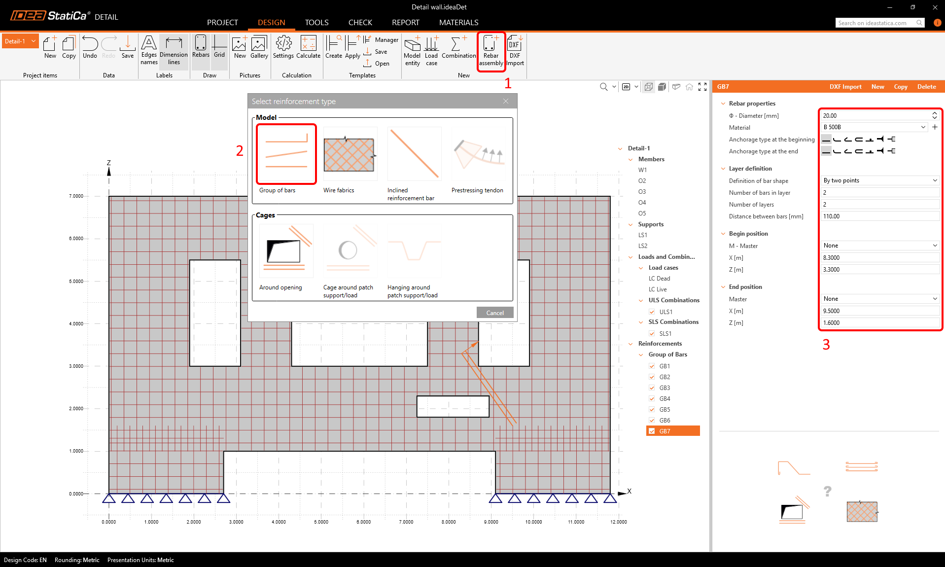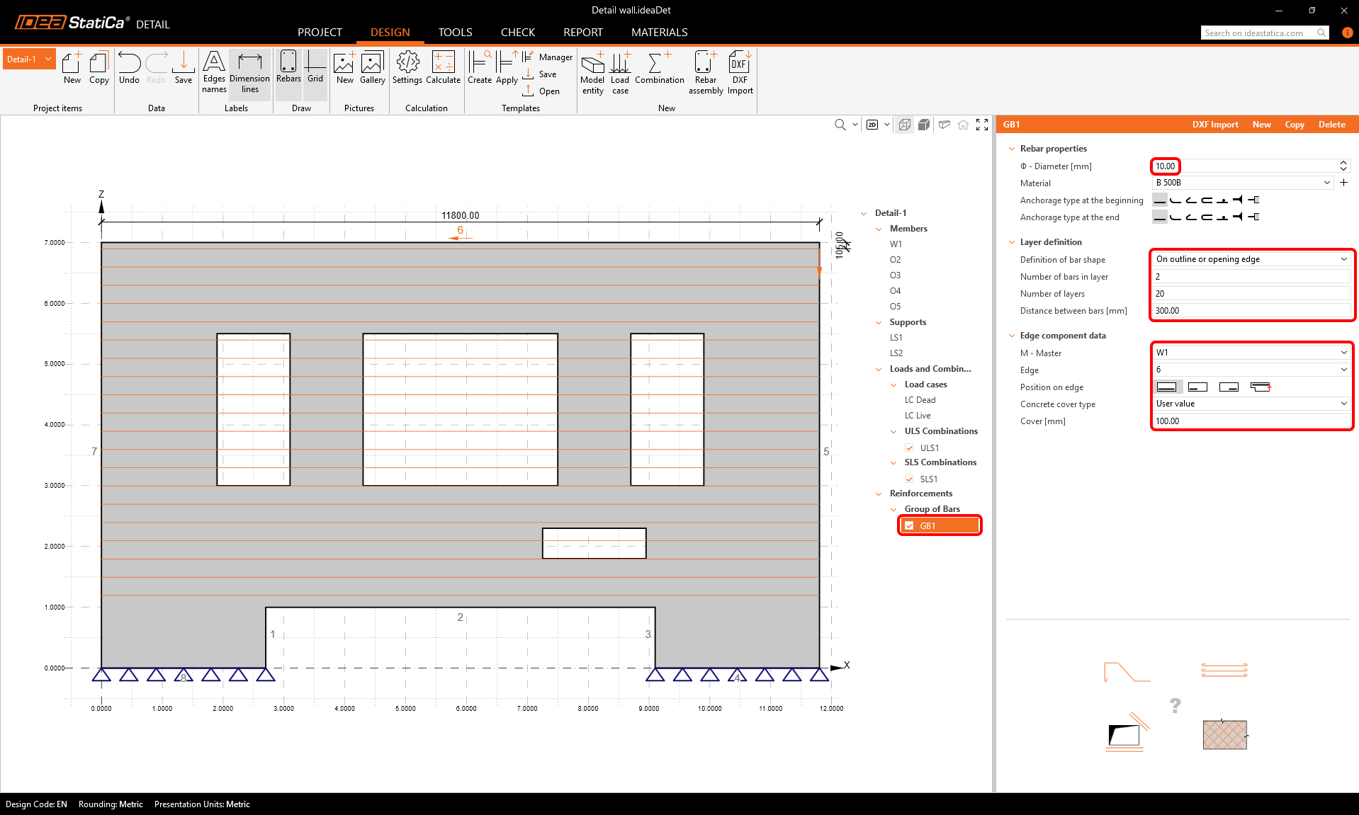 Define the properties of the reinforcement group like in the picture to input a group of horizontal bars into the wall.