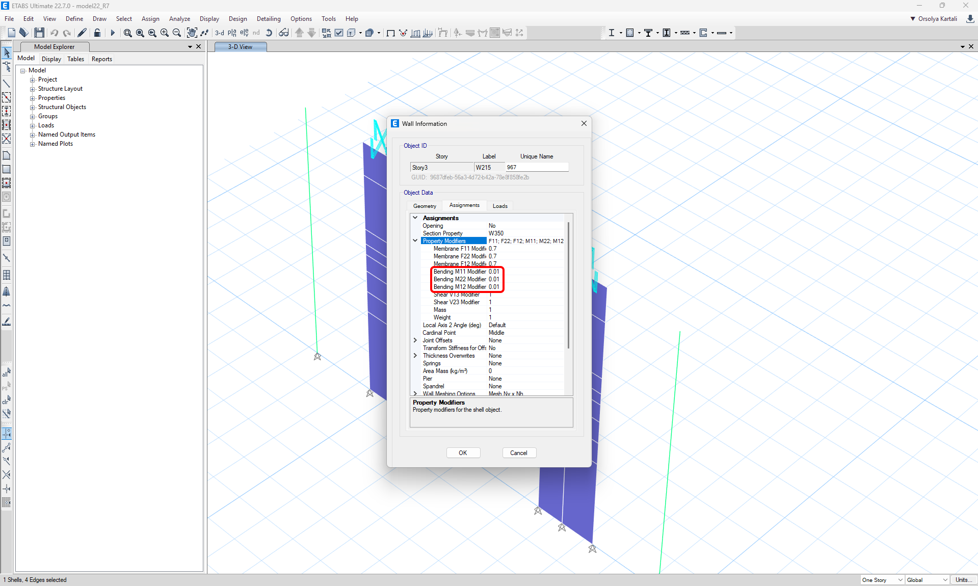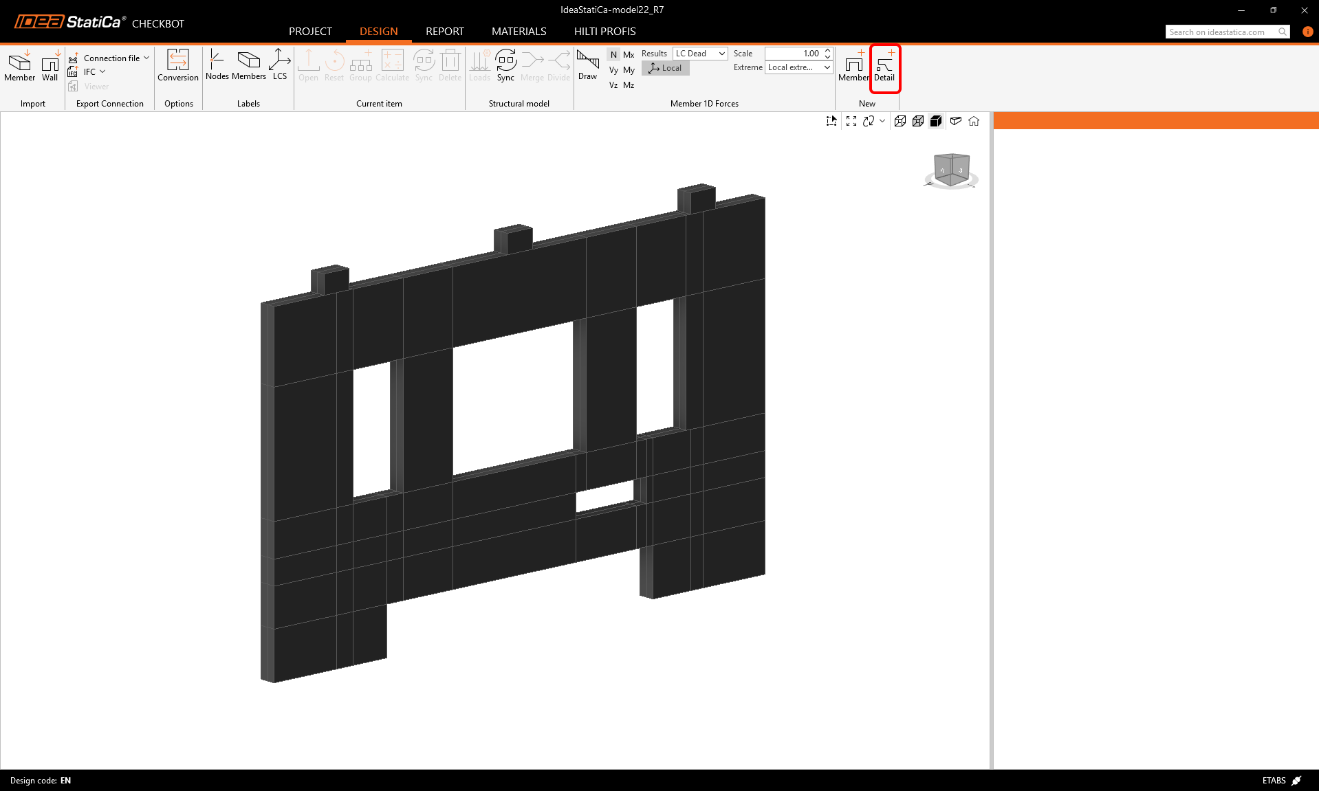 Detail calculates only with in-plane loads. To ensure that the wall transfers mainly in-plane loading, we can reduce the out-of-plane stiffness of the wall in ETABS. This will secure realistic load redistribution and Detail receives in-plane forces.