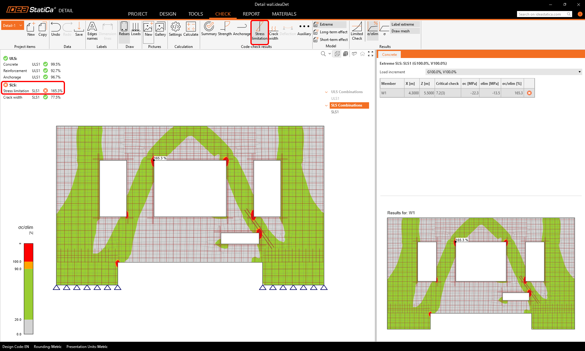 The only unsatisfactory check is the stress limitation check. We can display the results for it to see where the problems are.