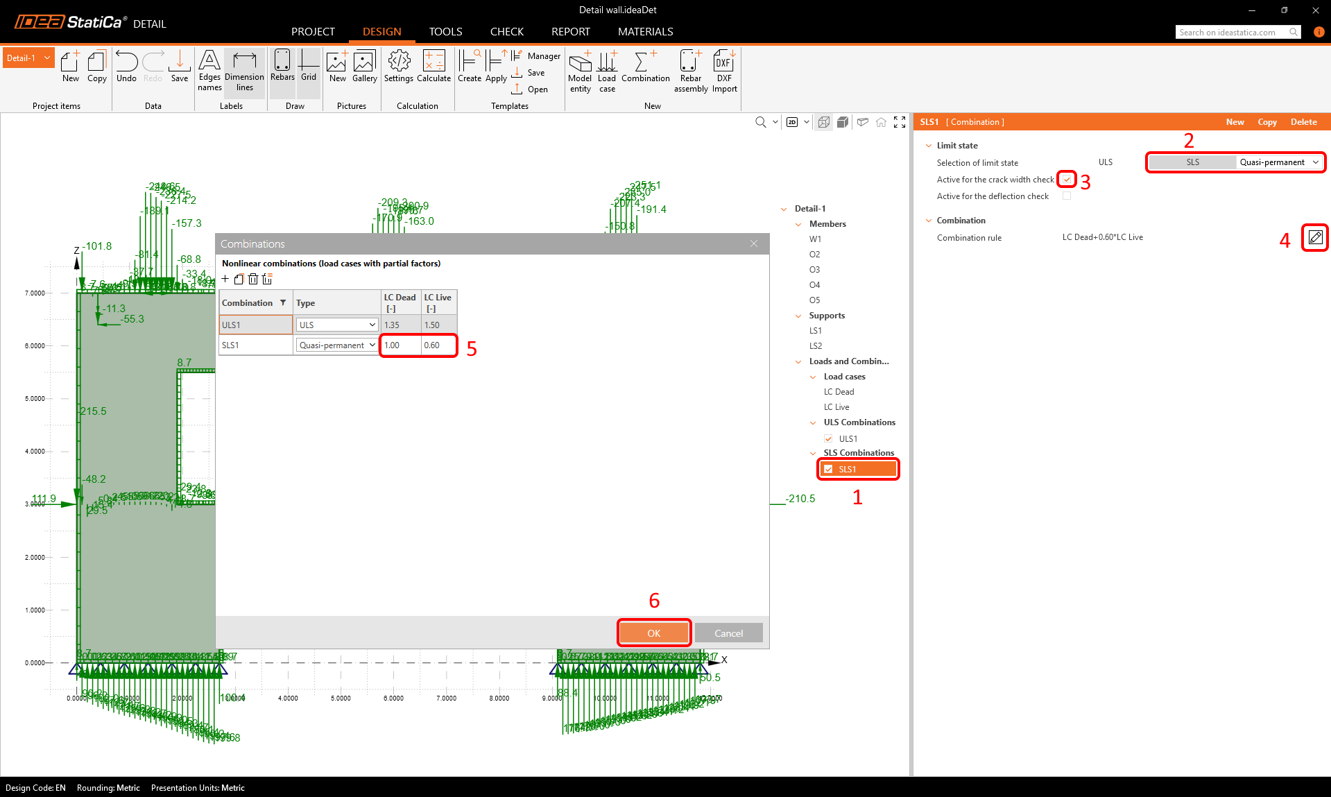 The second one should be an SLS combination. Let's change the settings of that combination, make it a Quasi-permanent one, active for crack width check, and set the load factors.