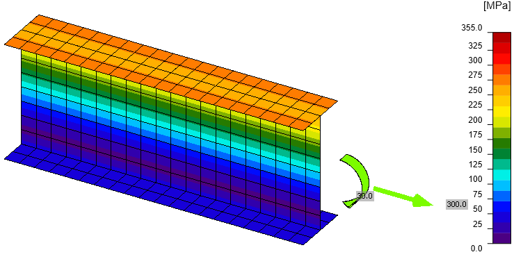 IDEA StatiCa shows slightly higher normal stress (178.1 MPa) than the analytical approach (173.3 MPa). The only difference is caused by the assumed cross-section in IDEA StatiCa with slightly different cross-sectional parameters: