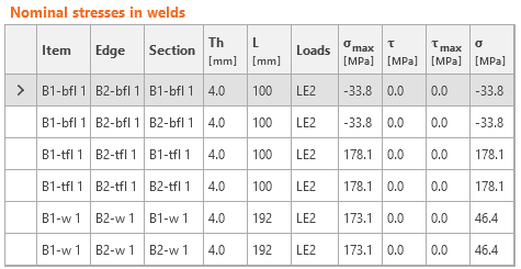 Planes are automatically generated near the butt welds and the stresses are shown in the check table: