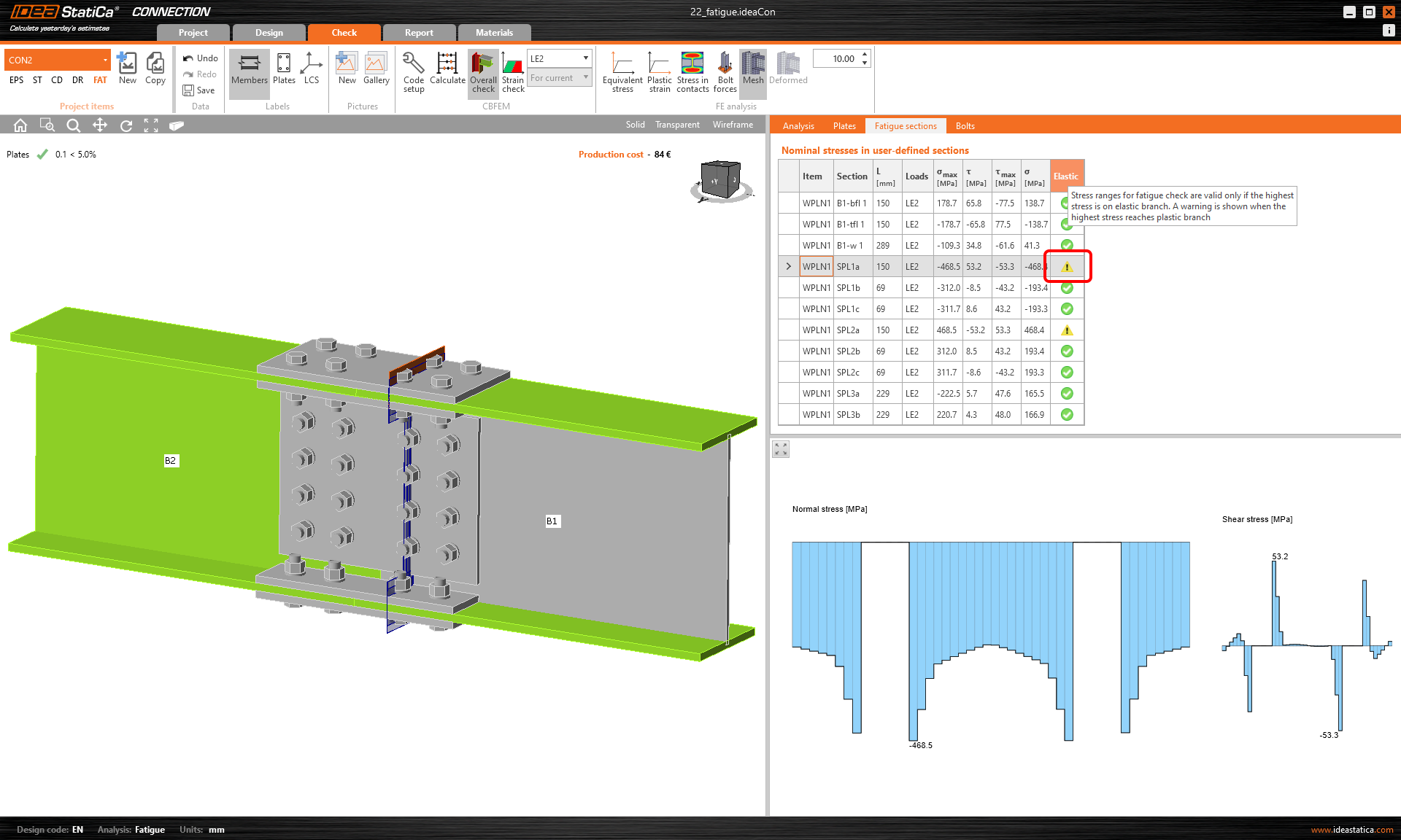 - If the strain reaches the plastic branch of the material diagram, a warning is shown (for plates, sections, bolts, welds, and anchors).