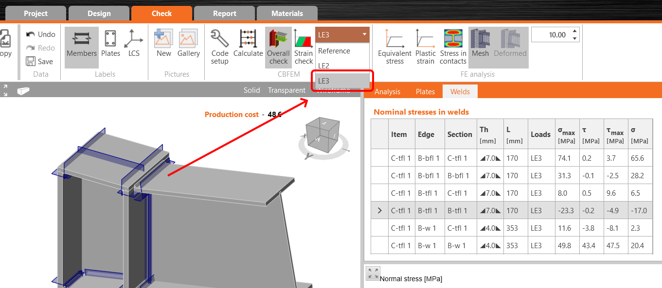 If you input more load cases (e.g. the "Reference", LE2 and LE3), you can read results for each load case by switching between LE on the upper ribbon.