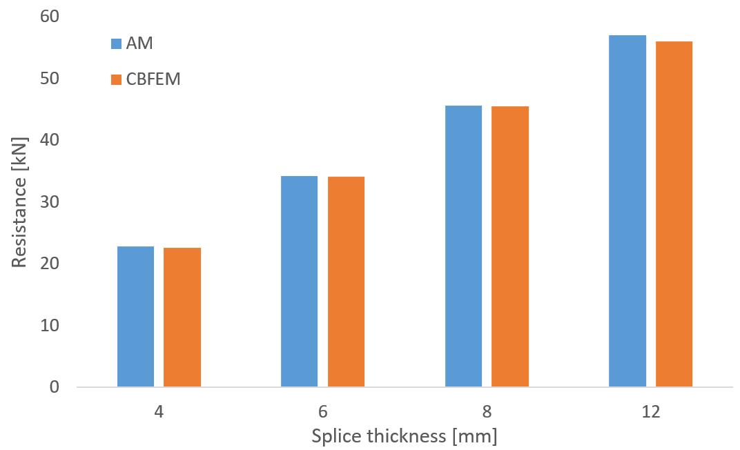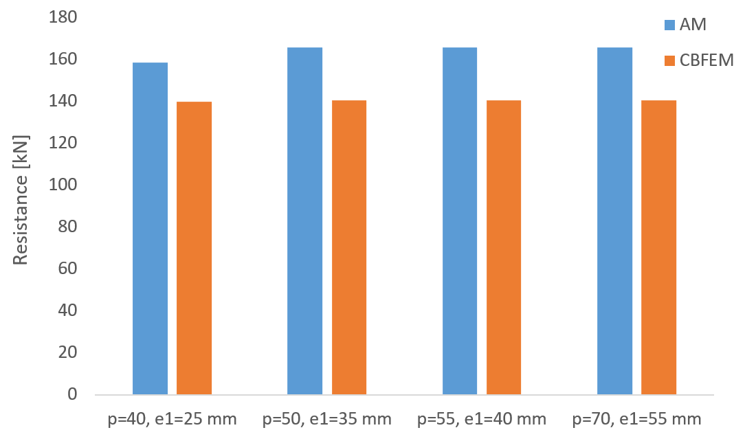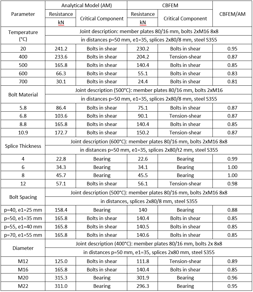 Design resistances calculated by CBFEM were compared with the results of analytical model (AM). Results are summarized in Tab. 1. Steel grade was in all cases S355. The parameters are temperature, bolt material, splice thickness, bolt diameter and bolt distances.