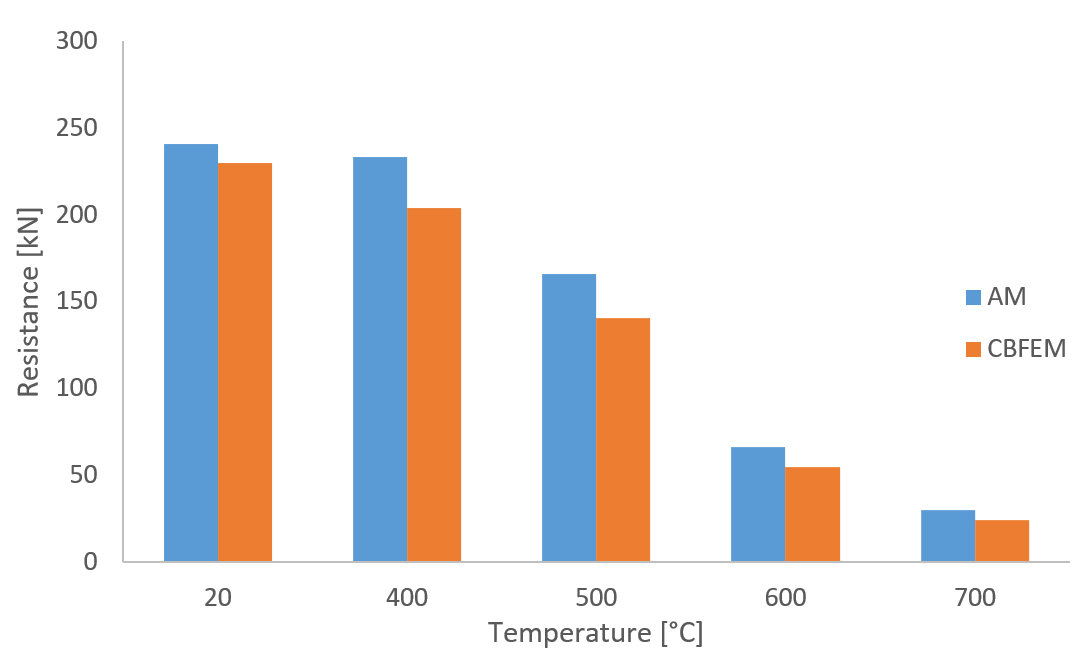 IDEA StatiCa Connection provides the same or safer load resistances for all investigated cases of bolted lap joints at elevated temperatures. The reason is primarily the loading of bolts. Bolts in the analytical model are loaded purely by shear force, and any tensile forces due to plate deformations are neglected.