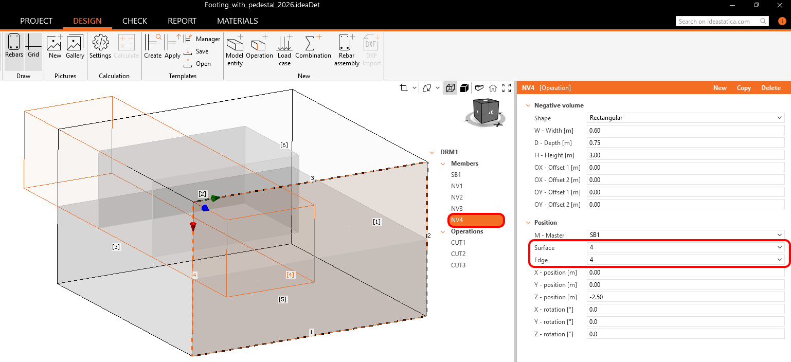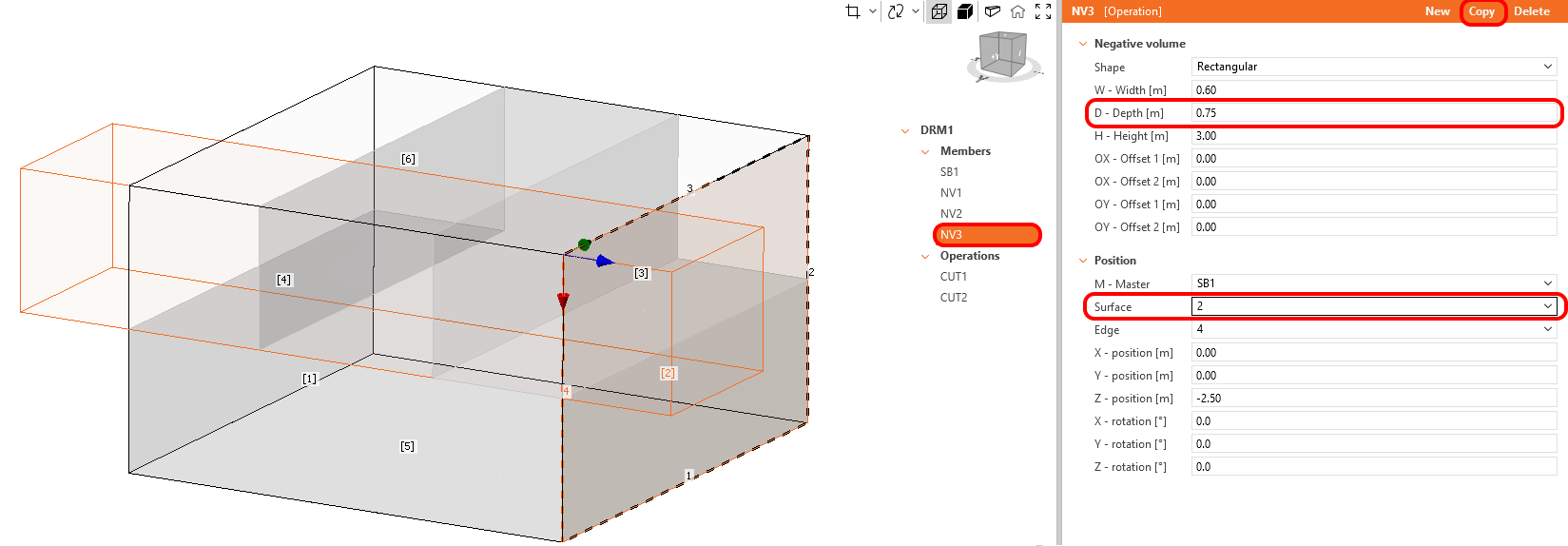Upon creating NV3, it is imperative to adjust the Depth to 0.75 meters and reallocate the Surface numbering to 2.