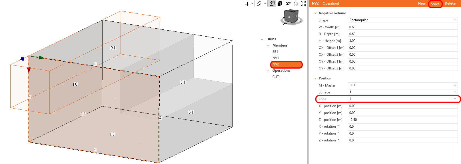 Define the dimensions of Negative Volume->Surface - 1 ->Edge - 3 -> Local Z-position - 2.5 m. The transparent mode depicts the negative volume.